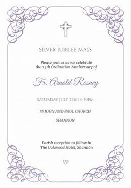 Fr. Arnold Rosney is celebrating 25 years of ordination to the priesthood. To mark this very special occasion, there will be a Silver Jubilee Mass on Saturday the 23rd of July at 6.30pm in SS John and Paul Church. Following the Mass there will be a Parish reception in the Oakwood Hotel. All are welcome to come and join in this celebration.