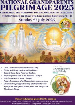 The National Grandparents Pilgrimage to Knock Shrine, which coincides with the World Day for Grandparents and the Elderly, will be held on Sunday, July 27th, 2025. This year’s theme, “Blessed are those who do not give up hope” (cf. Sir 14:2) calls us to celebrate the steadfast witness of elders and to create new traditions that unite generations.