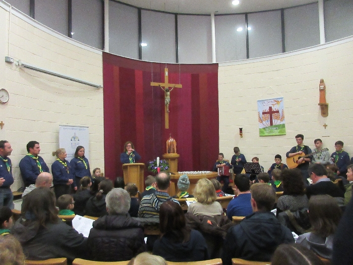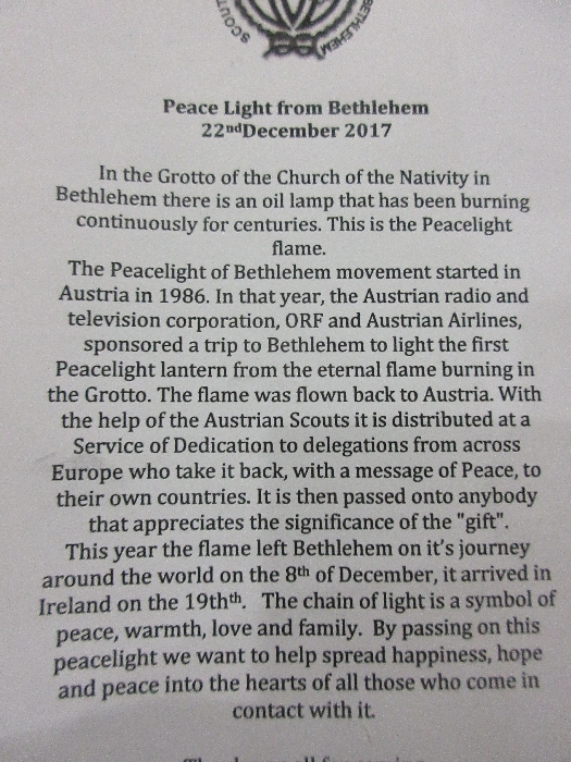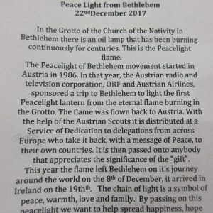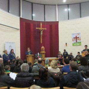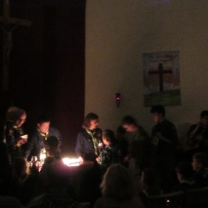 Scouts and cubs from Shannon along with their Leaders and families gathered in the Adoration Chapel in Skycourt on Friday 22nd December to receive the Peace Light from Bethlehem. This gathering is now part of the annual tradition in the scouting calendar in Shannon. With music and song, the scouts and cubs took time to reflect and pray as we all await the birth of the Christ Child from Bethlehem.