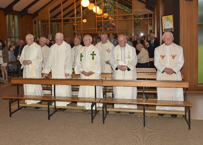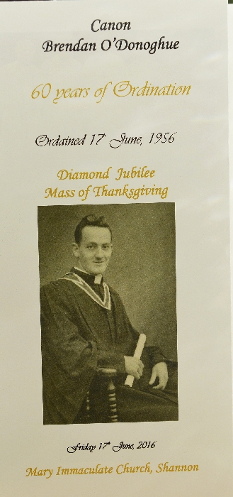 Friday 17th June 2016 was a very special day in the life of Shannon Parish as the community gathered in Mary Immaculate Church to celebrate the Diamond Jubilee of the Ordination to the Priesthood of Canon Brendan O’Donoghue. On 17th June 1956 in St. Patrick’s College Maynooth, Canon Brendan along with his classmates Canon Reuben Butler, Pat Taaffe, and Seamus Mullin were ordained priests for service in the Diocese of Killaoe. Fr Pat Carmody, Cooraclare was ordained the previous week in St Patrick’s College, Carlow. On Friday night all five priests who between them have given 300 years of service to the diocese and Church celebrated a Mass of thanksgiving.