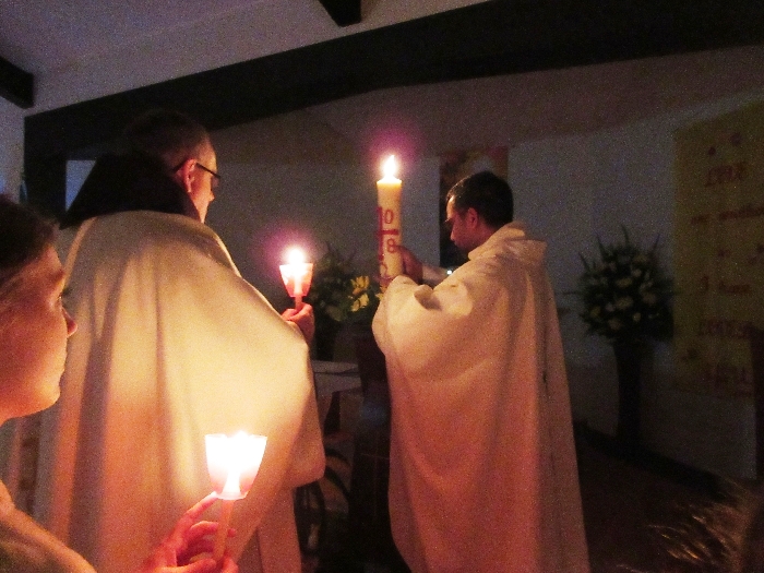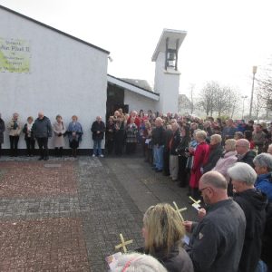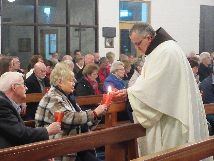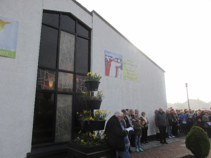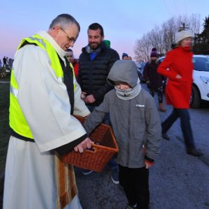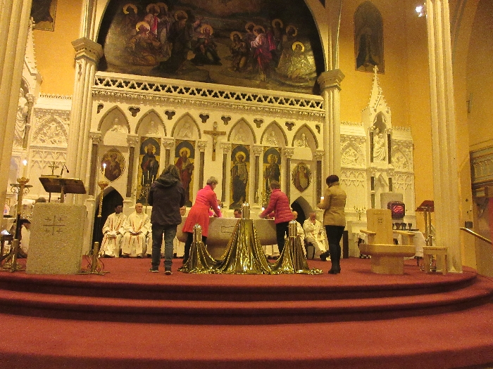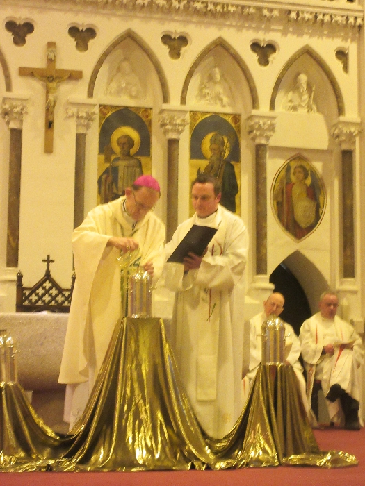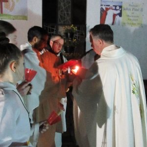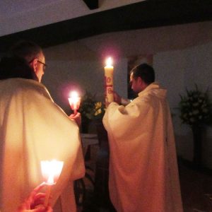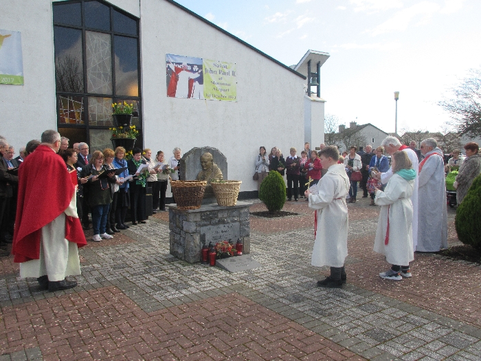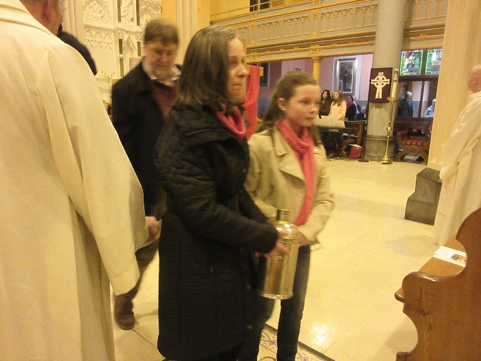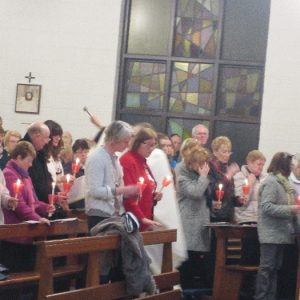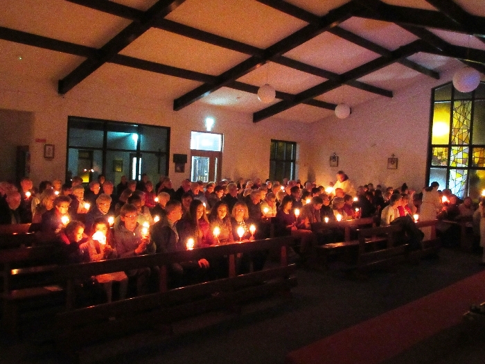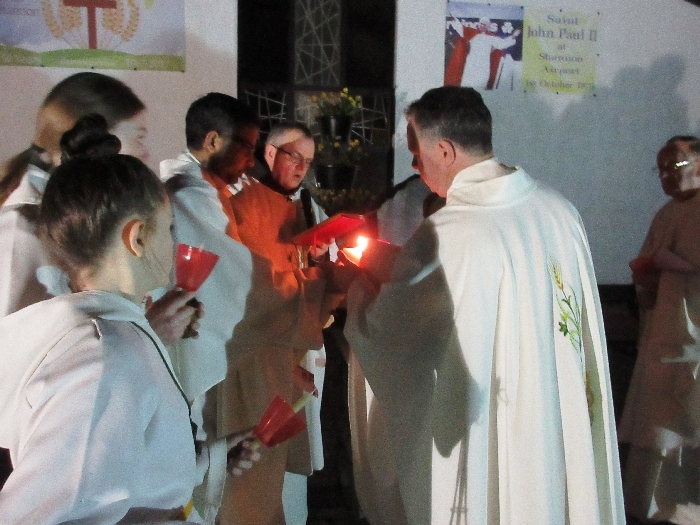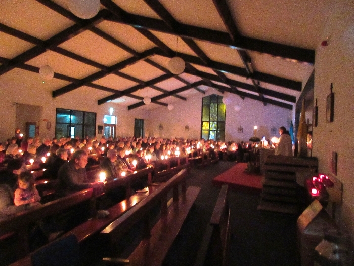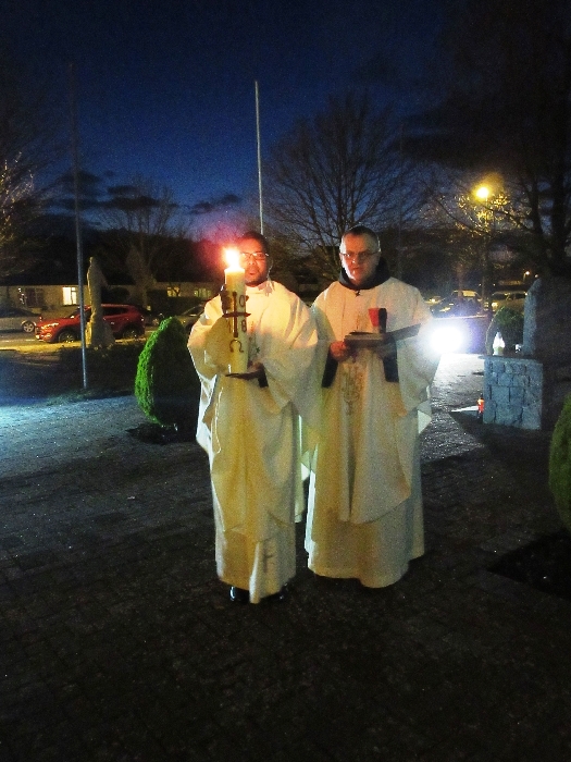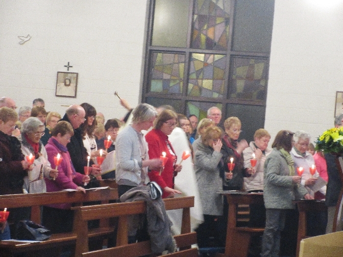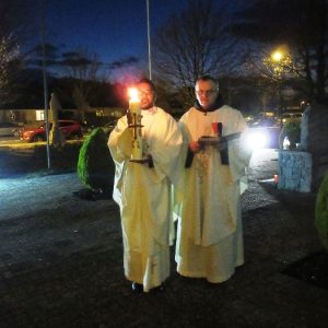 The oil of Cathecumen used in Baptism , the oil of Chrism used in Baptism, Confirmation and Ordination and the oil of the Sick. Bishop Fintan invites the priests present with the support of the people to renew their Priestly commitment. After Mass the priests gathered in the Chapter Room of the Cathedral to bring the Holy oils home to their respective parishes. All the priests of the parish concelebrated the Mass of the Lord’s Supper on Holy Thursday evening in SS John & Paul Church. Fr Arnold was the principal celebrant and washed the feet of some parishioners. Mary Hynds, on behalf of parishioners, invited the priests to renew their commitment to priesthood. At the end of the Mass the procession to the Altar of repose in Cuan Na nÓg took place where a vigil of watching and waiting was held until 10pm. The highlight of Holy week is the Easter Vigil. This year it was celebrated in SS. John & Paul Church at 9pm on Holy Saturday.