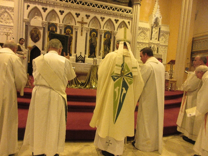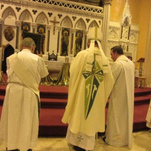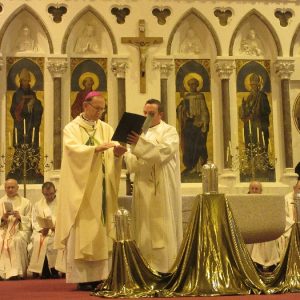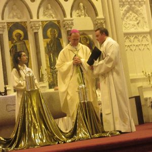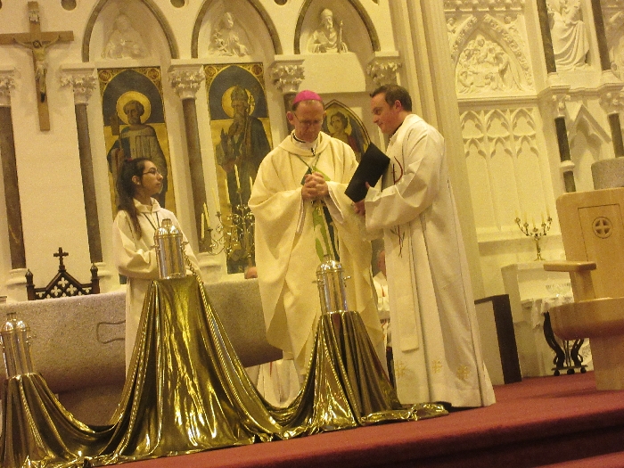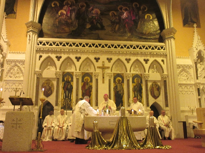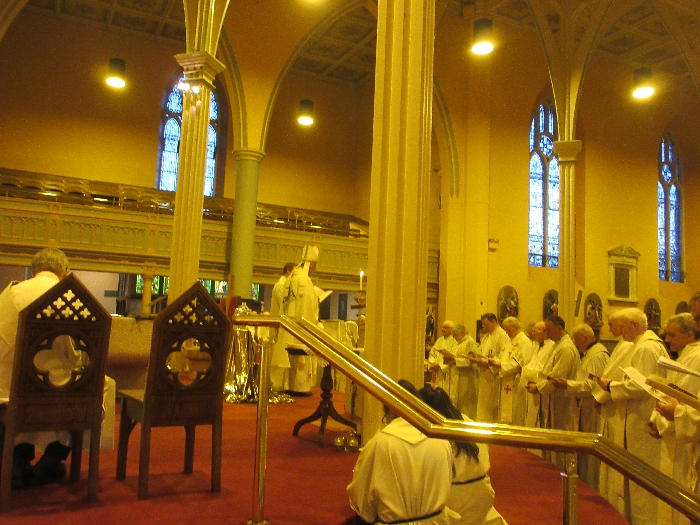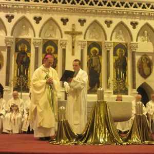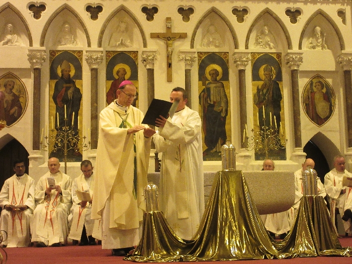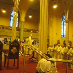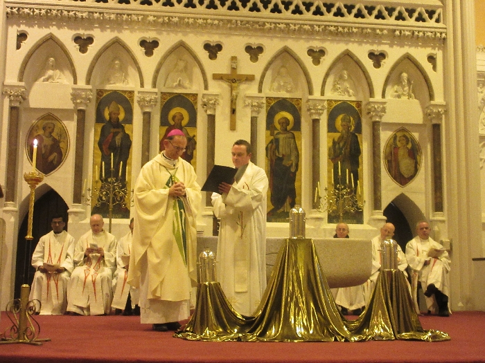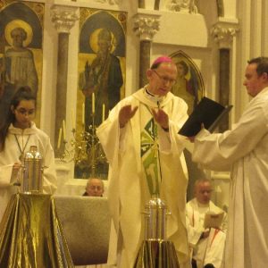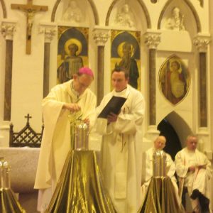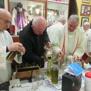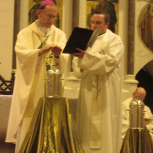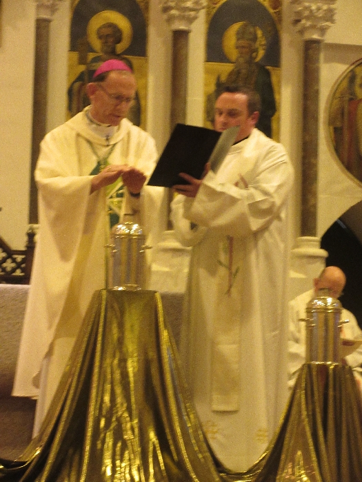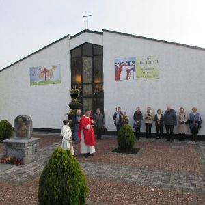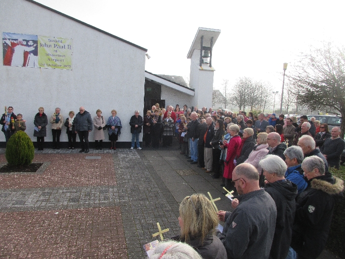 Holy Week celebrations began at the Vigil Mass on Saturday evening when Fr. Tom blessed the palm. At 10am on Sunday morning Fr. Arnold and the folk group led the Liturgy at the Jubilee Garden. Fr. Francis Xavier and the choir of Mary Immaculate Church continued the celebrations at 11am. Fr. Tom was joined by Bishop Willie Walsh and Fr. Peadar O’Loughlin SSC for the final Mass of Palm Sunday. The senior choir of SS John & Paul Church led by its director, Mary Lahiff, led the procession from the Jubilee Garden of SS John & Paul Church for the celebration of Sunday Eucharist. Our thanks to Michelle Justice for the photos. Bishop Fintan was joined by the Priests of the Diocese, our Deacon Martin Shanahan, and parishioners from many parishes throughout the Diocese for the annual Mass of Chrism in the Cathedral of SS. Peter & Paul Ennis on Wednesday evening. At this Mass the Holy Oils used in the celebration of the sacraments in the Diocese throughout the coming year were blessed by Bishop Fintan.