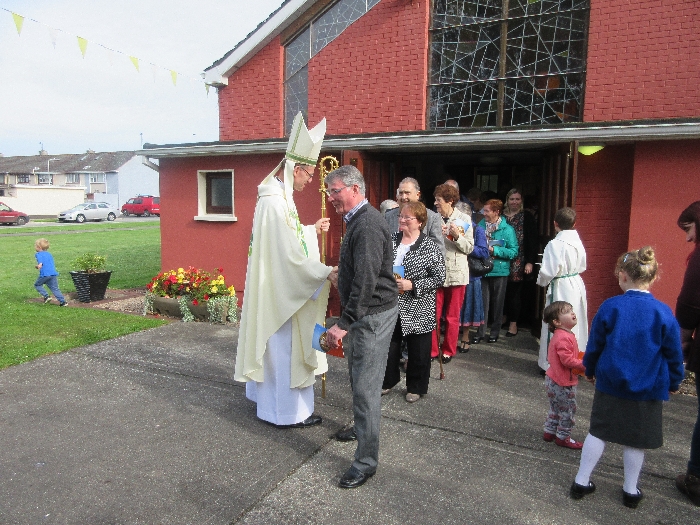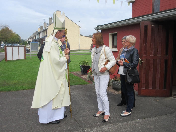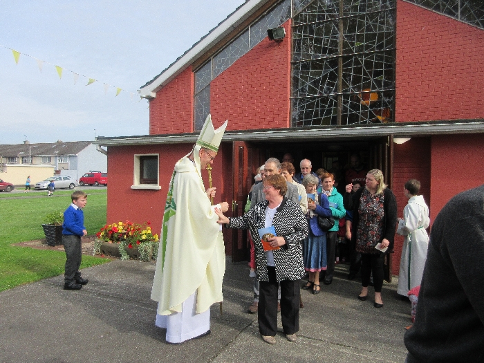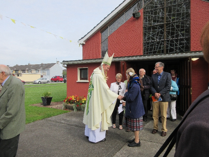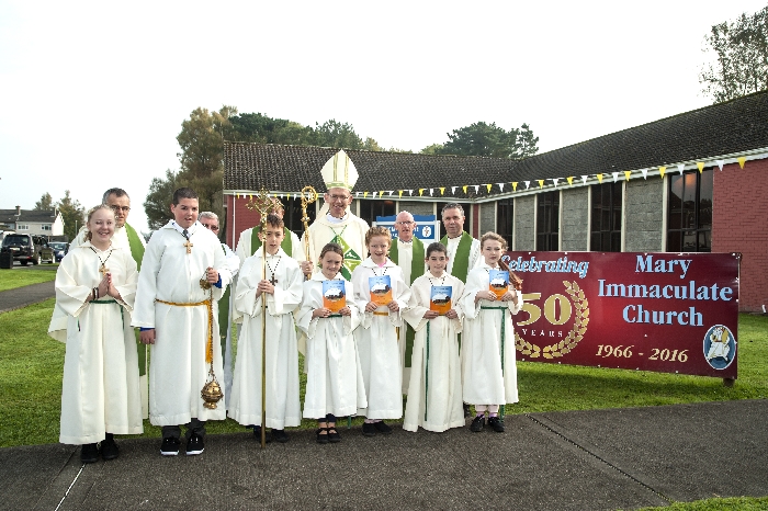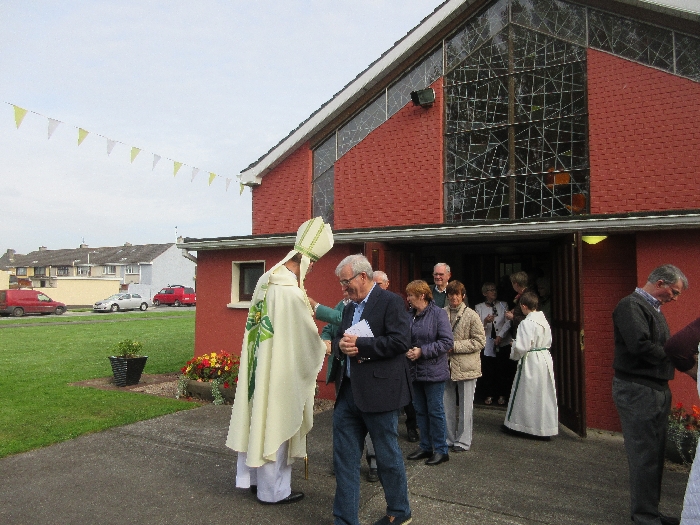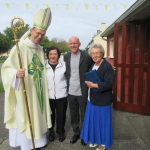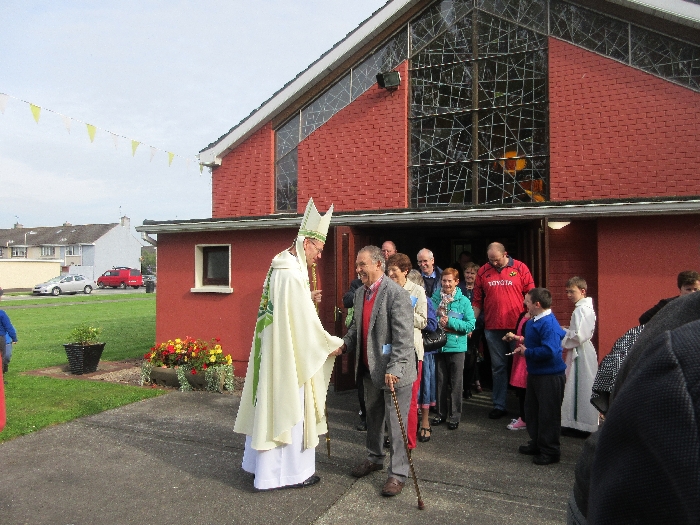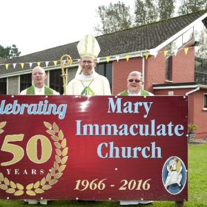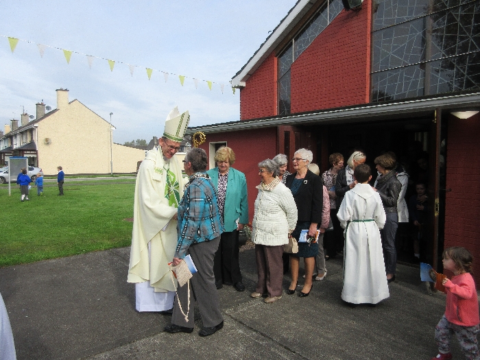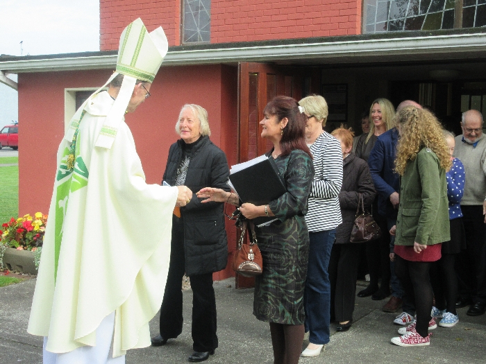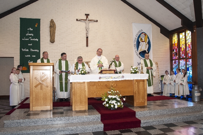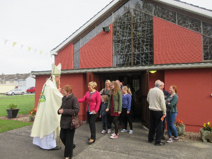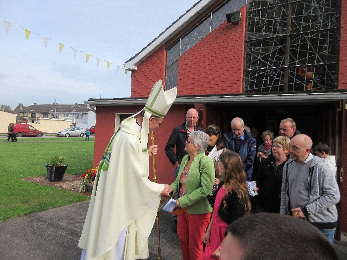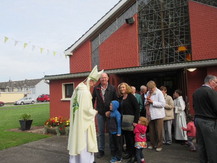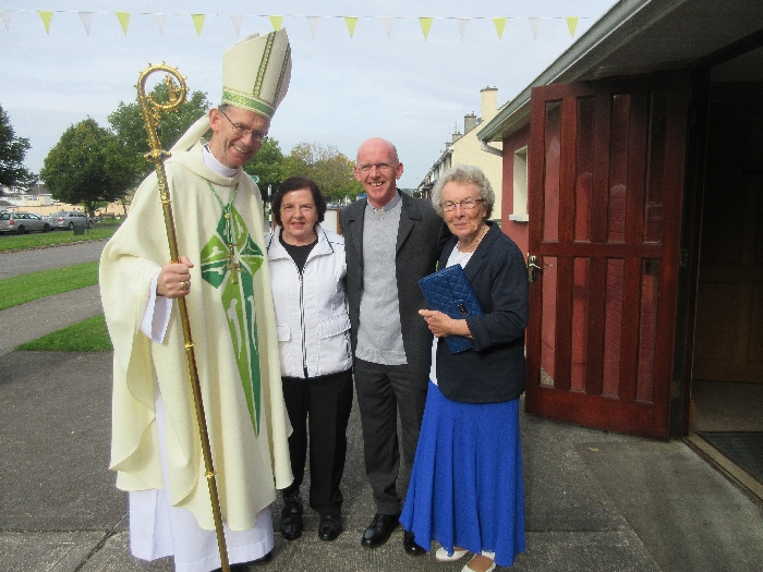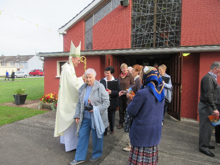 An important milestone in the history of Shannon took place on the Sunday 9th October when the newly ordained Bishop of Killaloe, Bishop Fintan Monahan, on his first visit to the Parish since his ordination on 25th September, celebrated the 11am Mass in Mary Immaculate Church. It was 50 years to the weekend when the Church was first blessed and dedicated. In its fifty years of service to the community, two priests have been ordained in the Church,Pat Byrne SVD from De Lacey Park and Fergal O’Neill, Ballycaseymore Hill. Both Fr Pat & Fr Fergal joined the priests of the parish, Fr Tom, Canon Brendan and Fr Arnold in celebrating the Mass of Thanksgiving with Bishop Fintan.