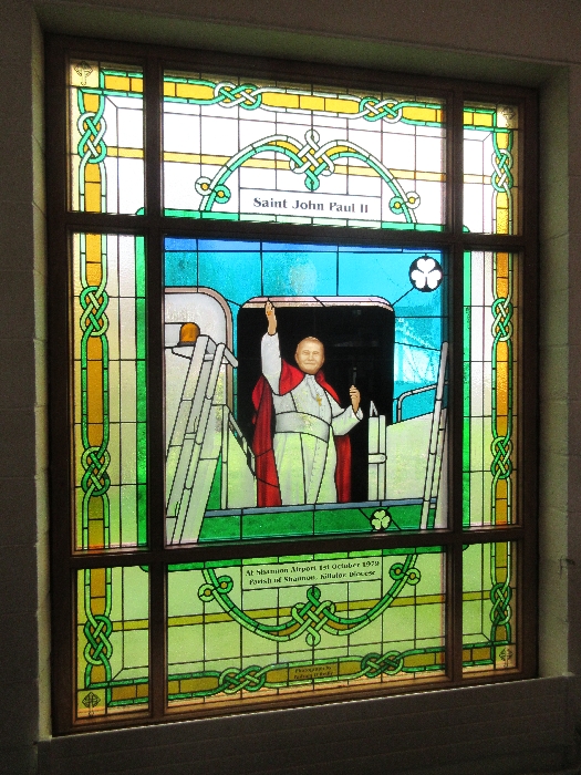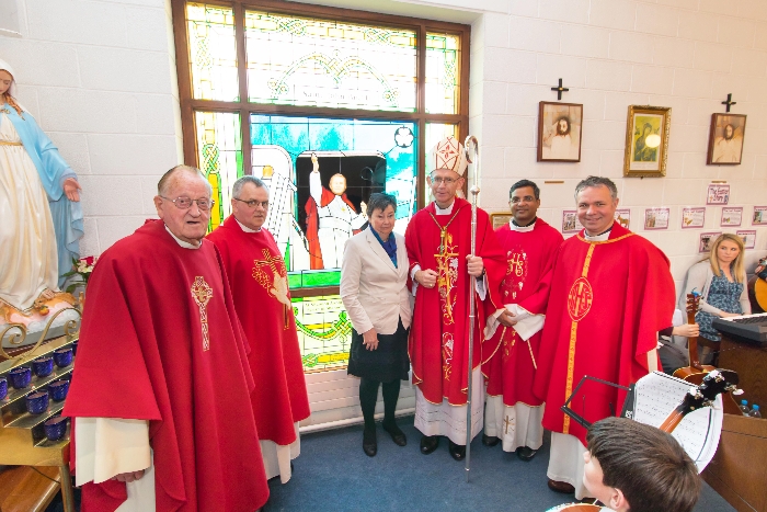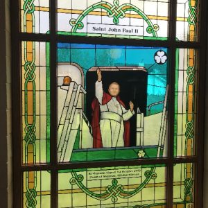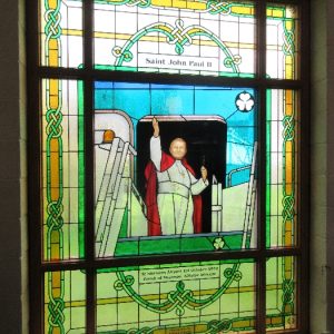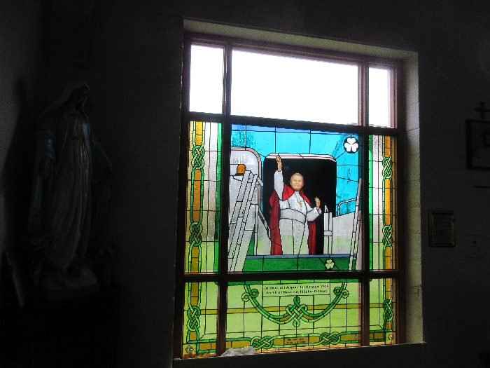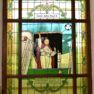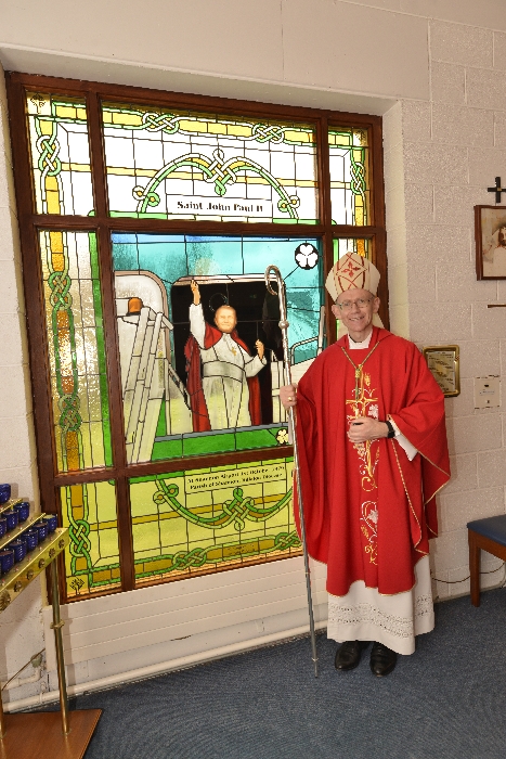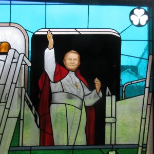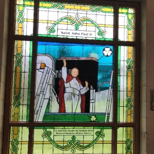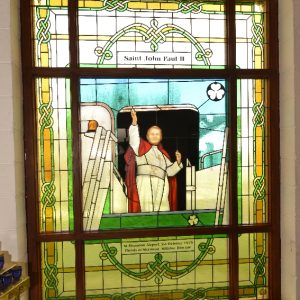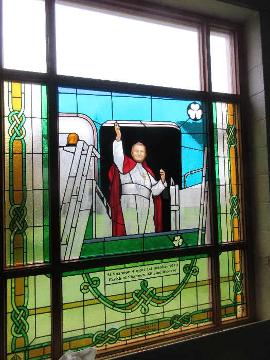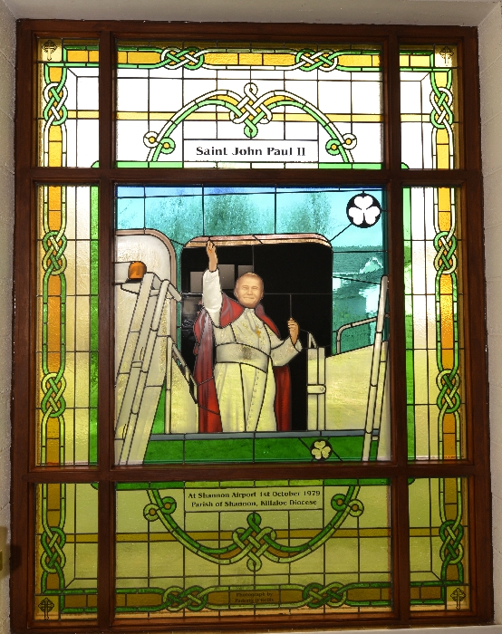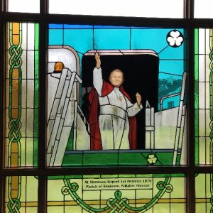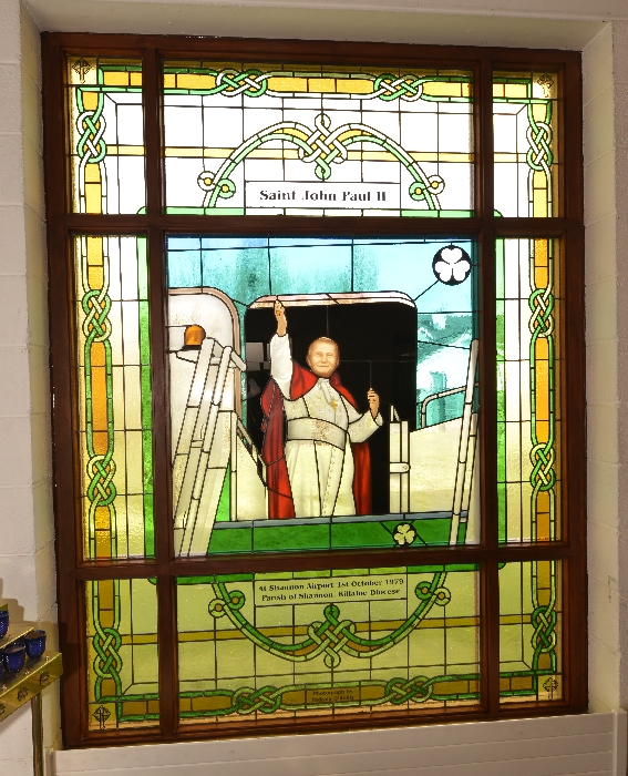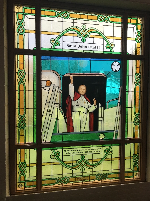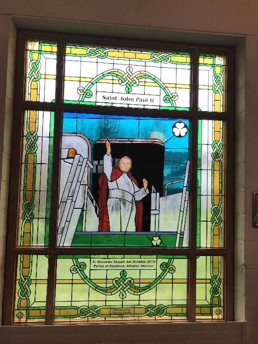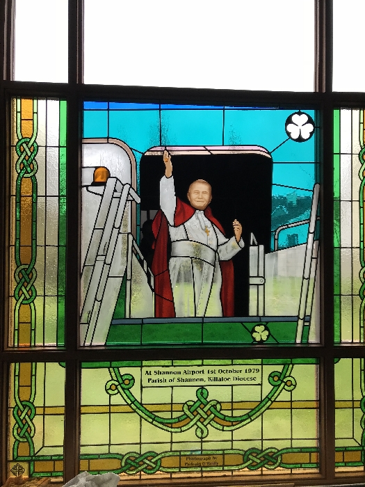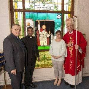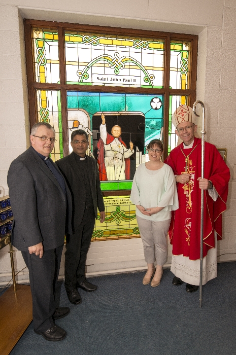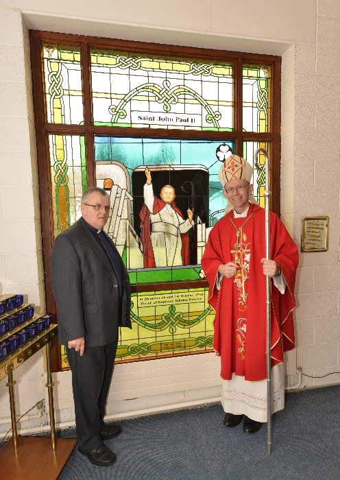 Following the Confirmation ceremony on Tuesday 17th April, Bishop Fintan blessed and dedicated the newly installed stained glass window of St. John Paul in the Church of SS John & Paul. This work was commissioned by the parish last year to celebrate the Golden Jubilee of the parish 1967-2017. The work depicts a photo of Pope John Paul II taken on the steps of the Aer Lingus plane at Shannon Airport on the 1st October 1979 as he gave his final blessing to Ireland on the first ever visit to the country by a Pope.