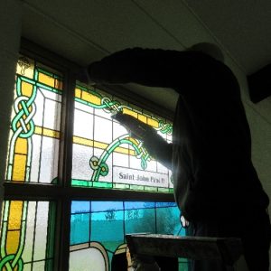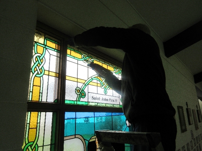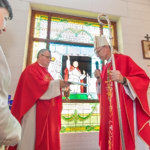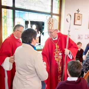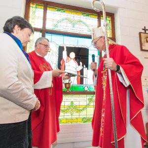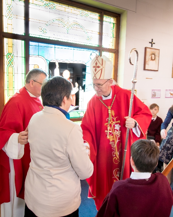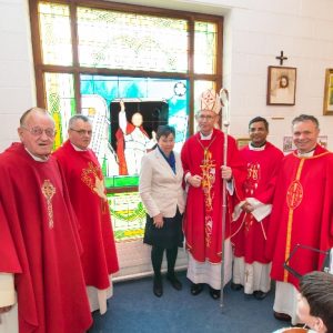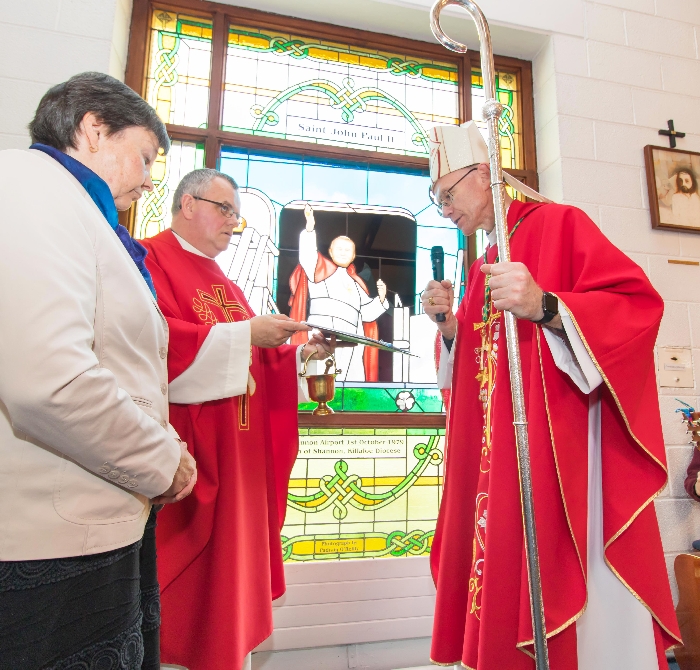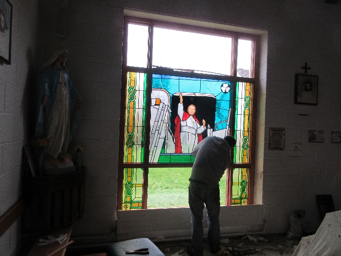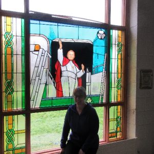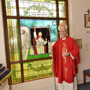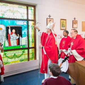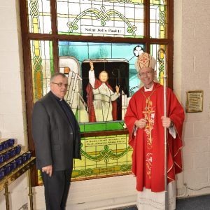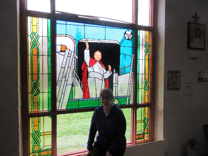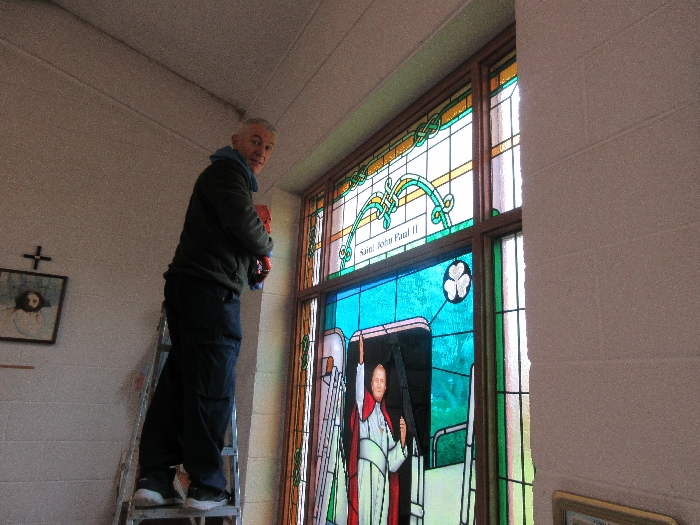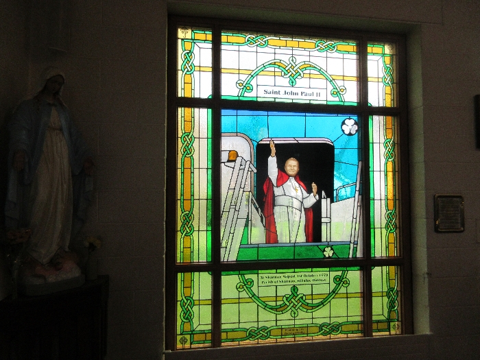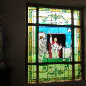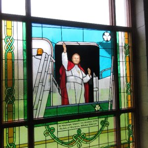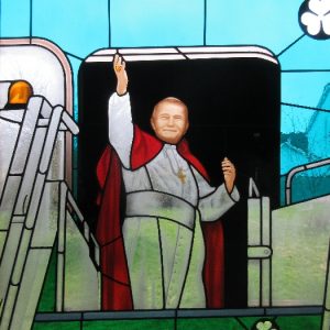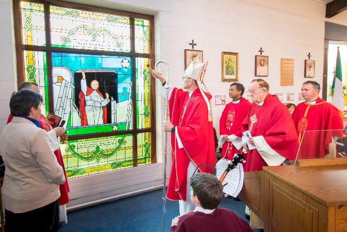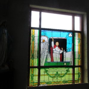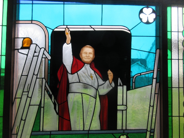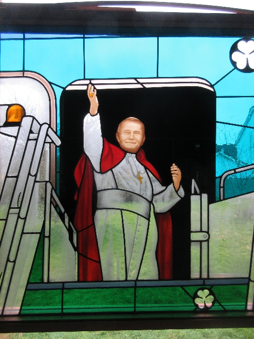 Following the Confirmation ceremony on Tuesday 17th April, Bishop Fintan blessed and dedicated the newly installed stained glass window of St. John Paul in the Church of SS John & Paul. This work was commissioned by the parish last year to celebrate the Golden Jubilee of the parish 1967-2017. The work depicts a photo of Pope John Paul II taken on the steps of the Aer Lingus plane at Shannon Airport on the 1st October 1979 as he gave his final blessing to Ireland on the first ever visit to the country by a Pope.