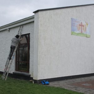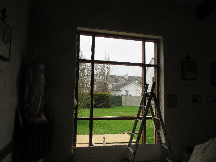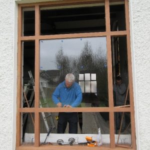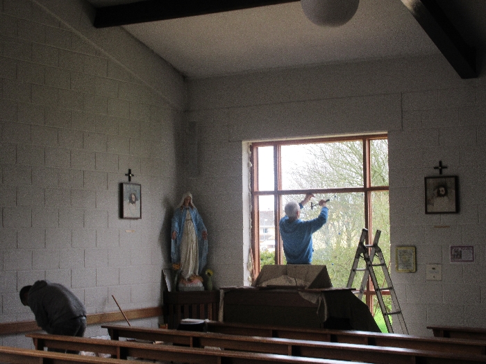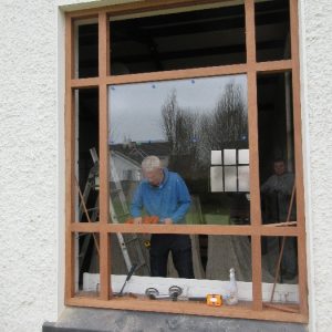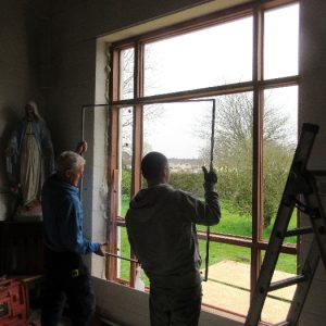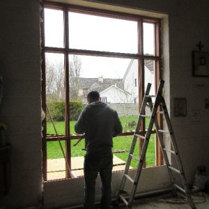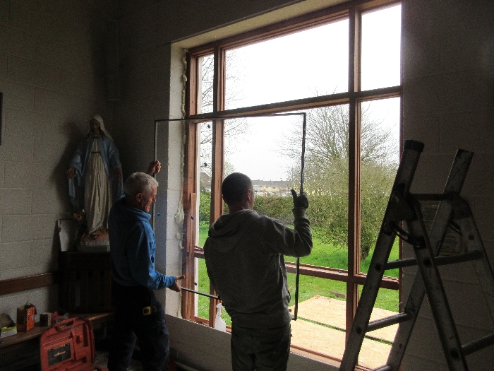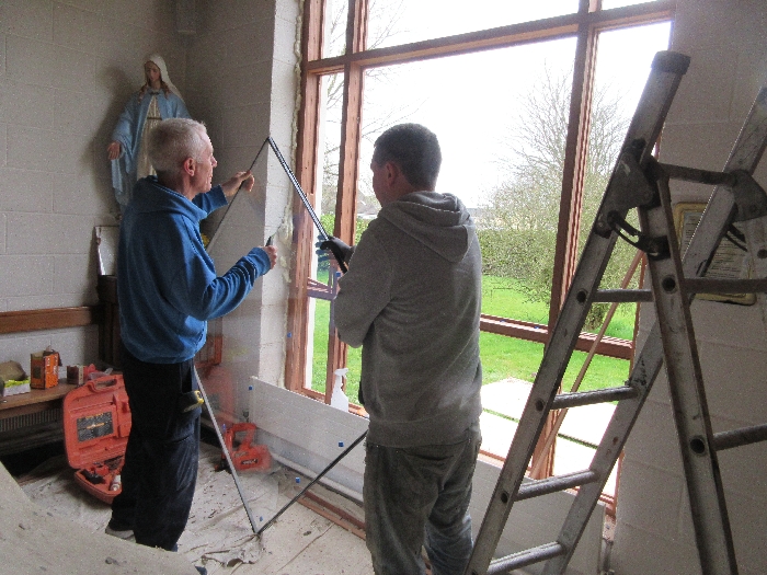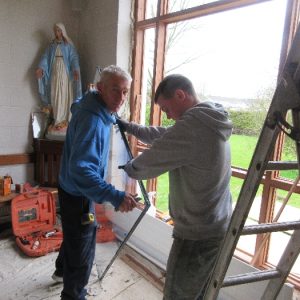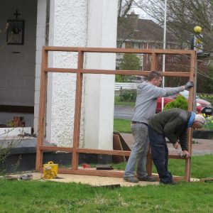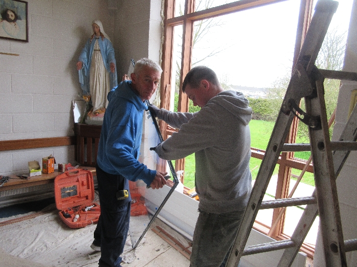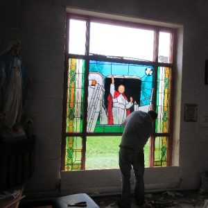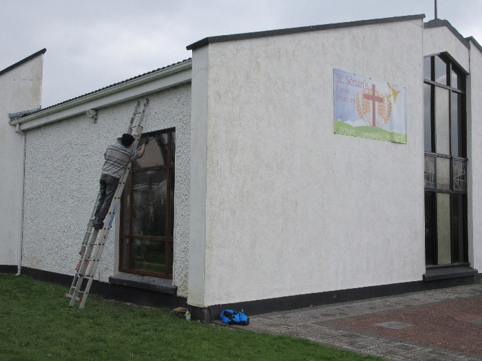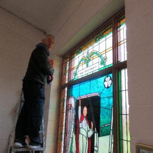 The work was created by a Derry City Art Glass Company. The photograph is the work of the late Padraig O’Reilly from Fergus Drive, Shannon, and he took it on his first assignment as a freelance photographer for the Clare Champion newspaper. His wife Mary and son Padraig attended the dedication with Bishop Fintan. We acknowledge the support we have received from the staff of Art Glass Ireland, Christy Collins who painted the frame of the window, The O’Reilly family who gave us permission to use the photograph and the many people who have made donations and contributions to date towards the cost involved. Thanks to Joe Buckley and Padraig O’Reilly for the photos.