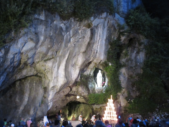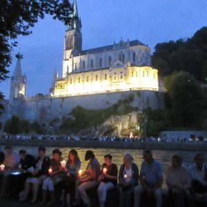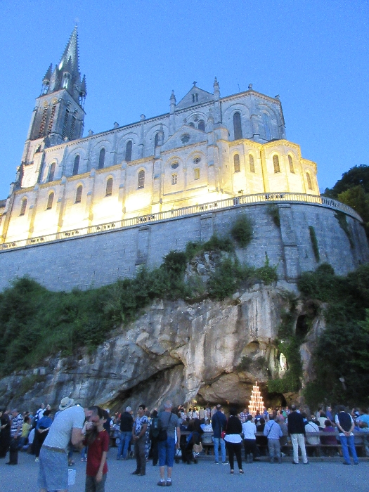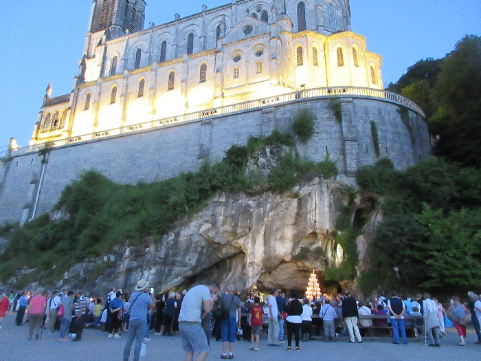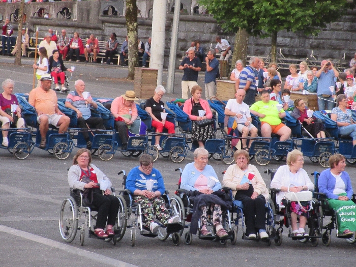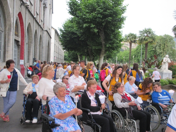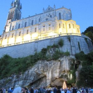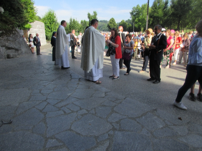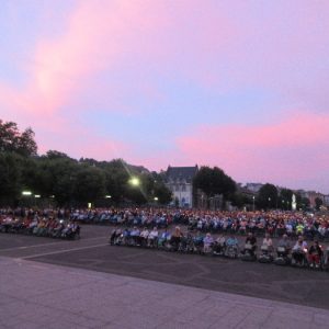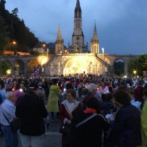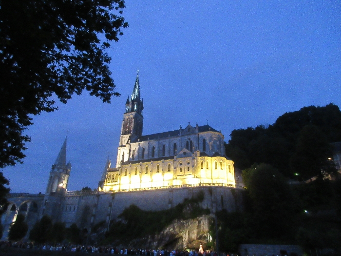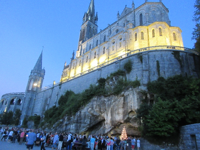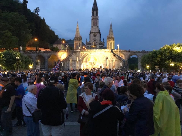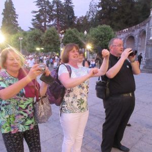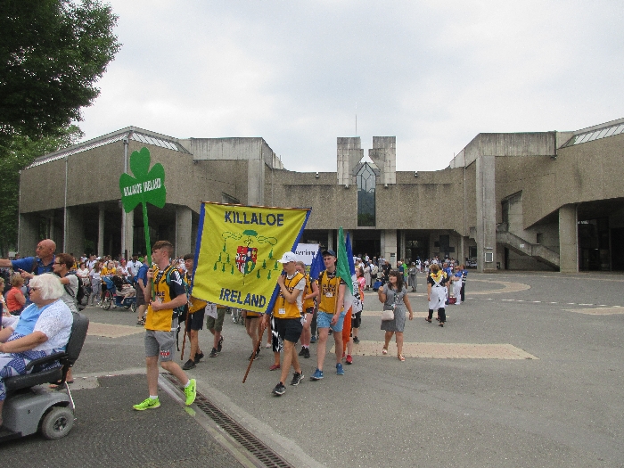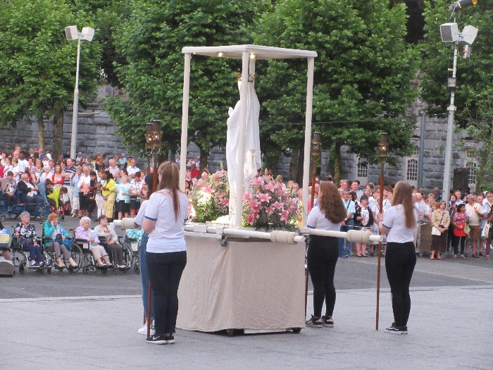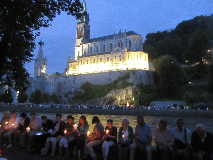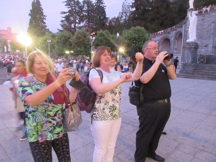 That spring still flows today and fills the baths in which the pilgrims of today still bathe as part of their journey. The Killaloe pilgrims did just that in advance of leading the Eucharistic Procession in the afternoon. Each night of the pilgrimage concluded with a praying of the rosary by candlelight before the grotto. During this restful time many will have recalled those for whom they were asked to pray and the needs that they carried in their hearts. Certainly there were busy and active times on this journey. The day in Lourdes is hinged by two great processions. The procession of the Eucharist in the afternoon and the great Marian Torchlight procession as the shadows of evening fall are attended by many thousands of visitors. We had the opportunity to lead both and carried our banners high. But there are the quiet and reflective moments too when real healing of the spirit can take place.