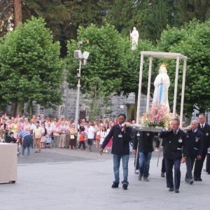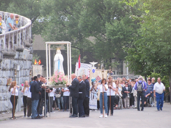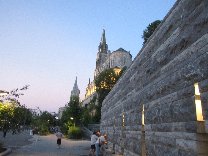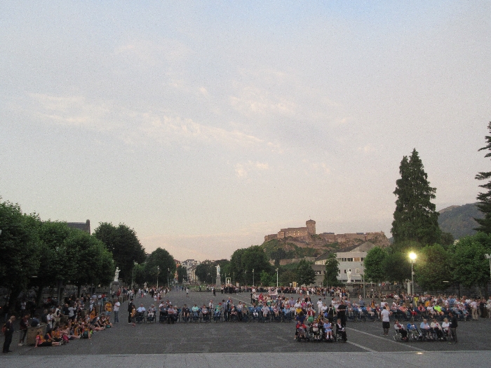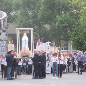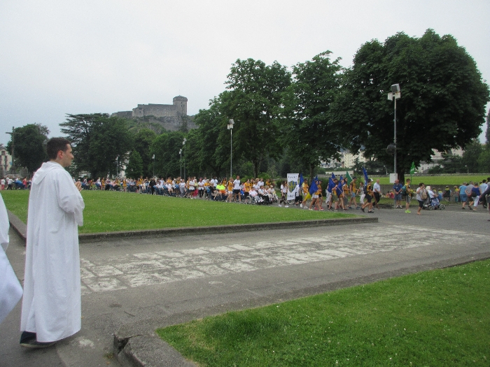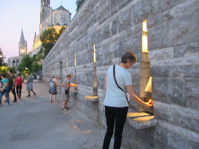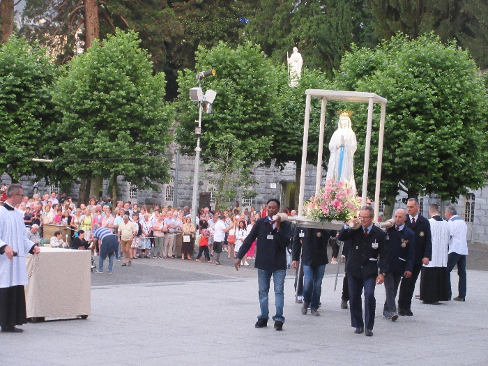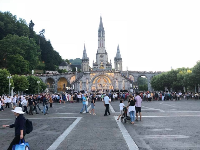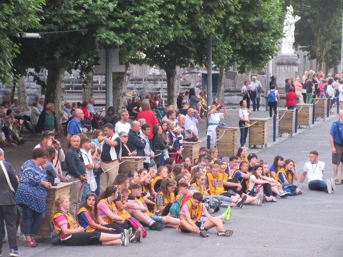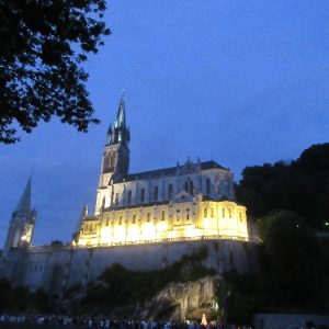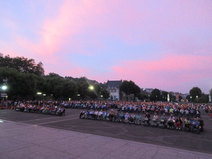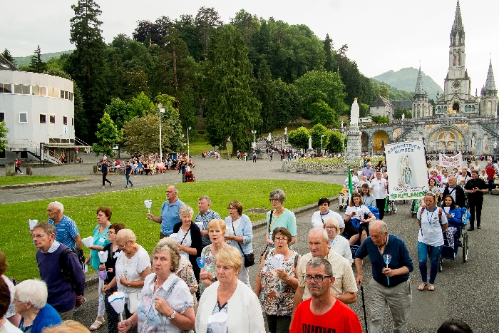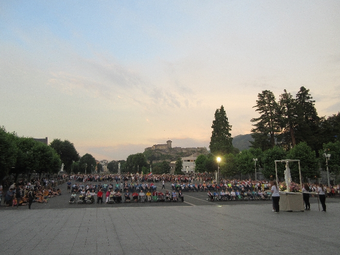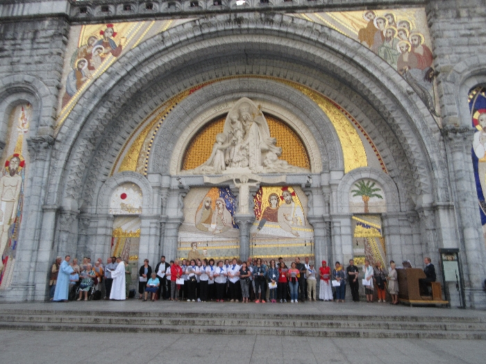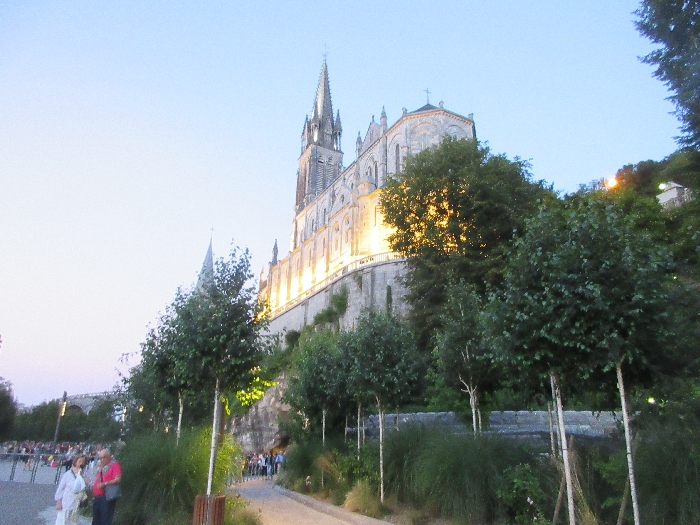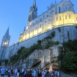 That spring still flows today and fills the baths in which the pilgrims of today still bathe as part of their journey. The Killaloe pilgrims did just that in advance of leading the Eucharistic Procession in the afternoon. Each night of the pilgrimage concluded with a praying of the rosary by candlelight before the grotto. During this restful time many will have recalled those for whom they were asked to pray and the needs that they carried in their hearts. Certainly there were busy and active times on this journey. The day in Lourdes is hinged by two great processions. The procession of the Eucharist in the afternoon and the great Marian Torchlight procession as the shadows of evening fall are attended by many thousands of visitors. We had the opportunity to lead both and carried our banners high. But there are the quiet and reflective moments too when real healing of the spirit can take place.