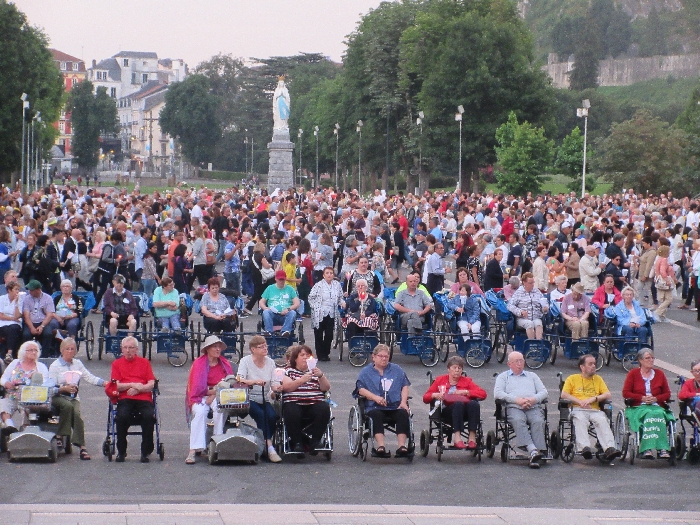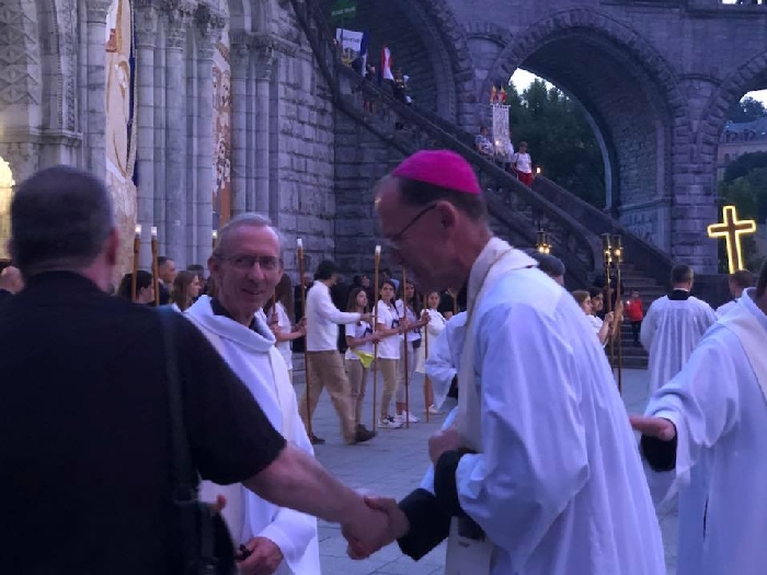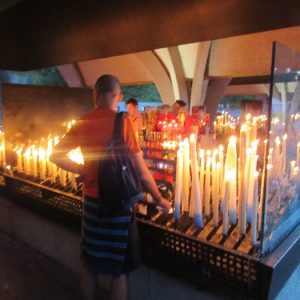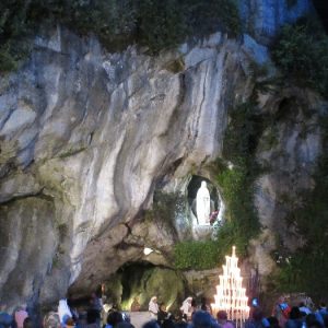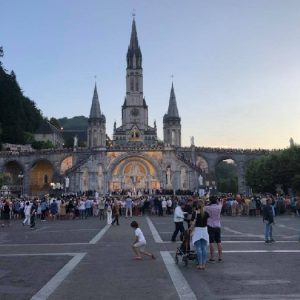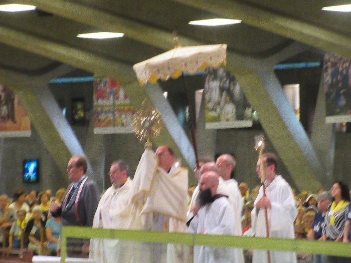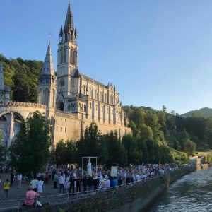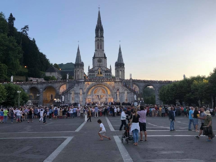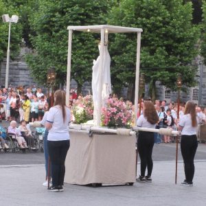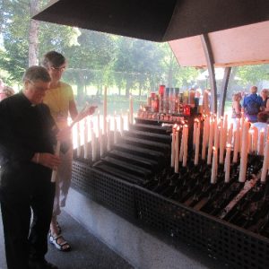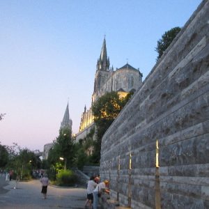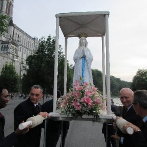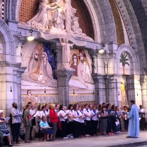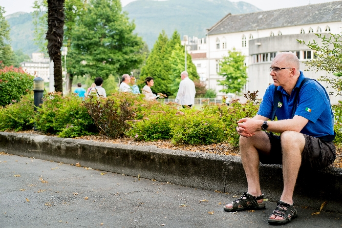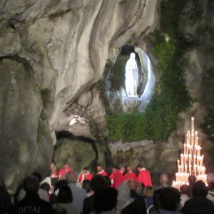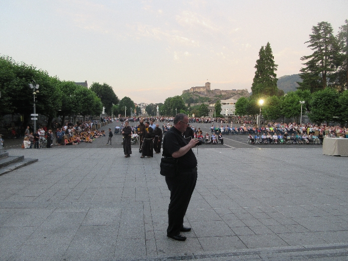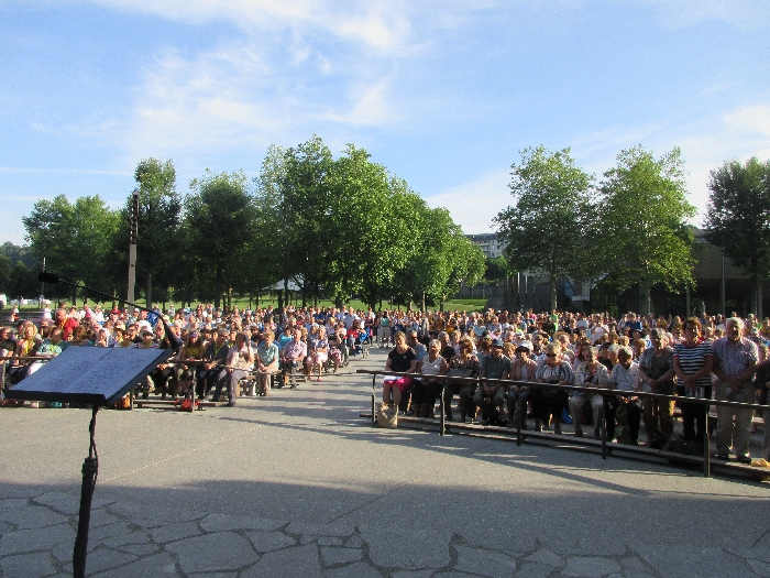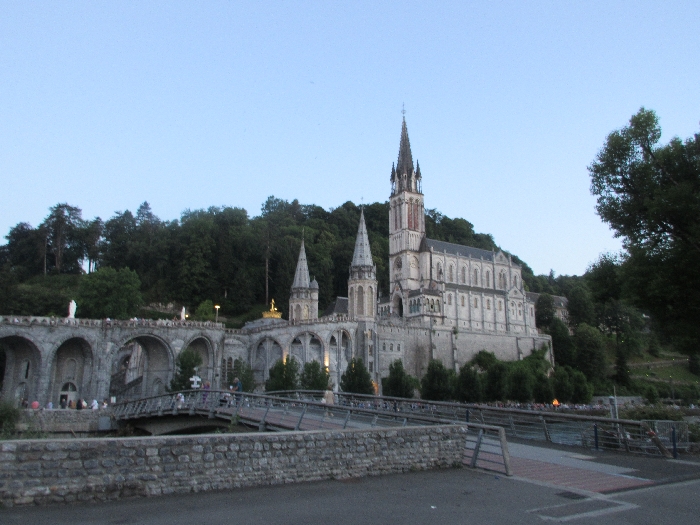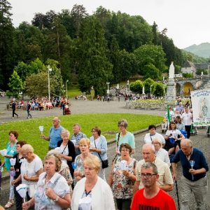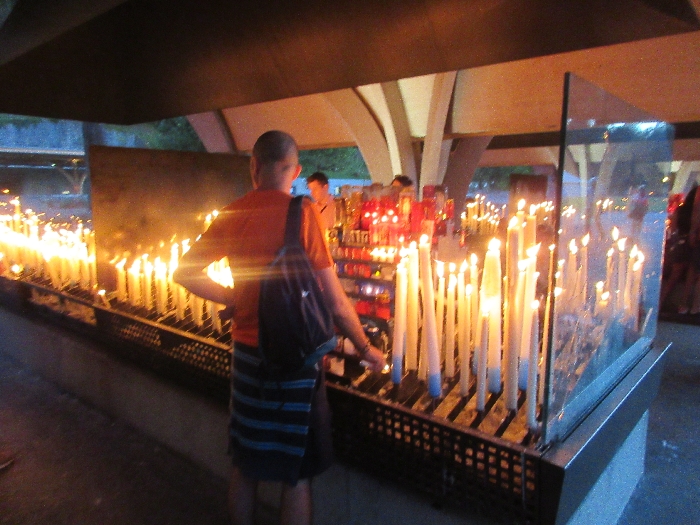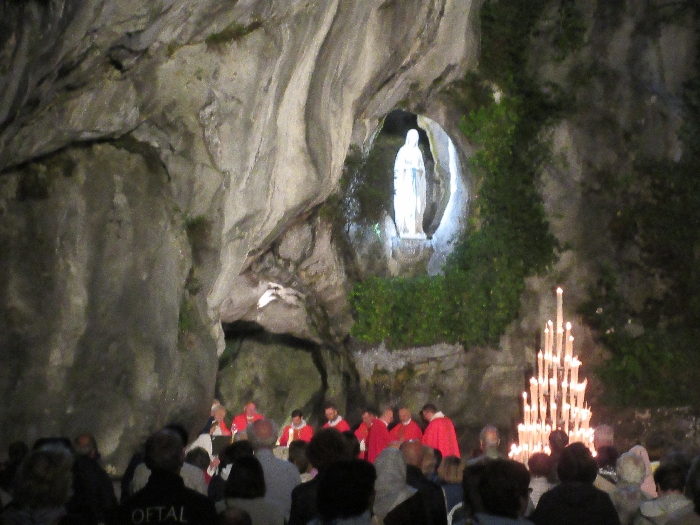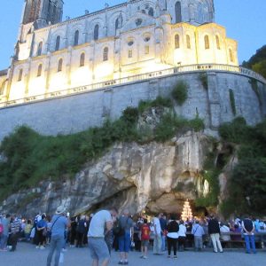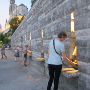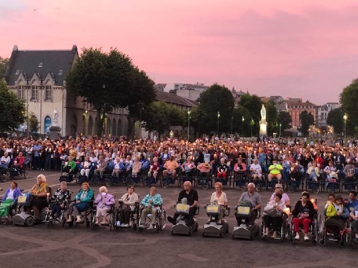 That spring still flows today and fills the baths in which the pilgrims of today still bathe as part of their journey. The Killaloe pilgrims did just that in advance of leading the Eucharistic Procession in the afternoon. Each night of the pilgrimage concluded with a praying of the rosary by candlelight before the grotto. During this restful time many will have recalled those for whom they were asked to pray and the needs that they carried in their hearts. Certainly there were busy and active times on this journey. The day in Lourdes is hinged by two great processions. The procession of the Eucharist in the afternoon and the great Marian Torchlight procession as the shadows of evening fall are attended by many thousands of visitors. We had the opportunity to lead both and carried our banners high. But there are the quiet and reflective moments too when real healing of the spirit can take place.