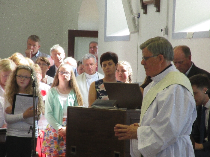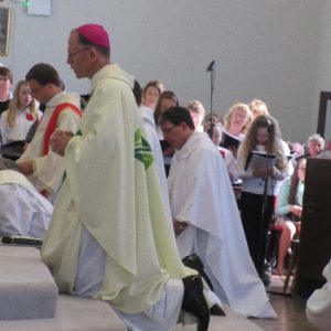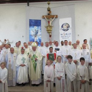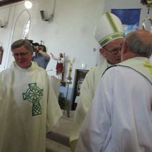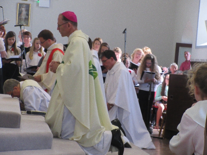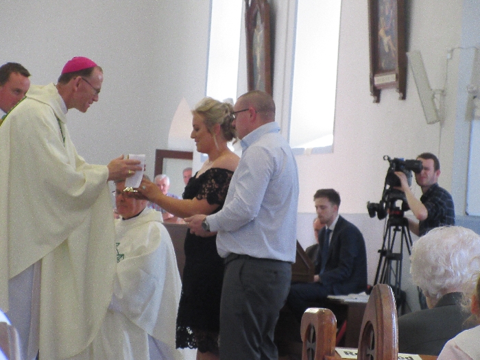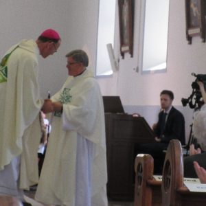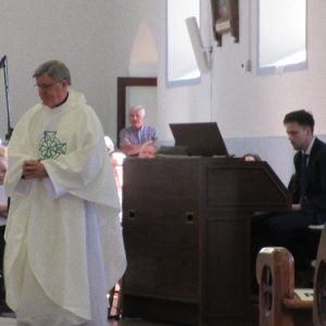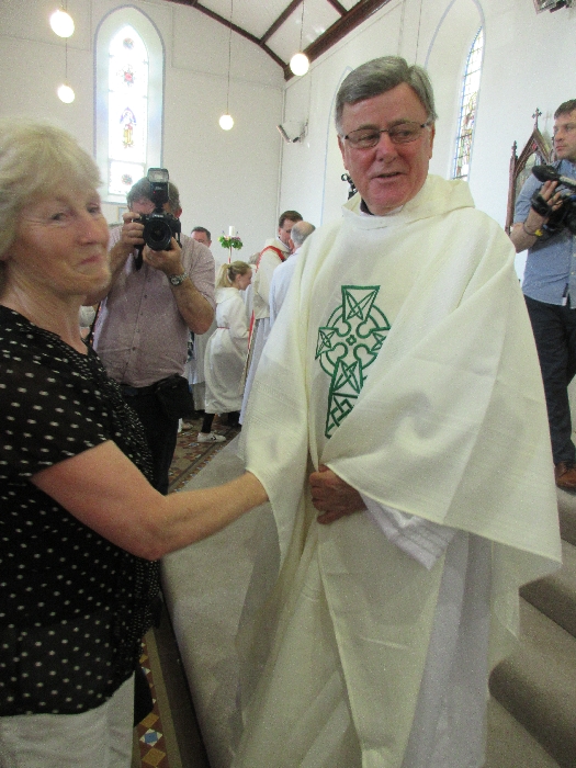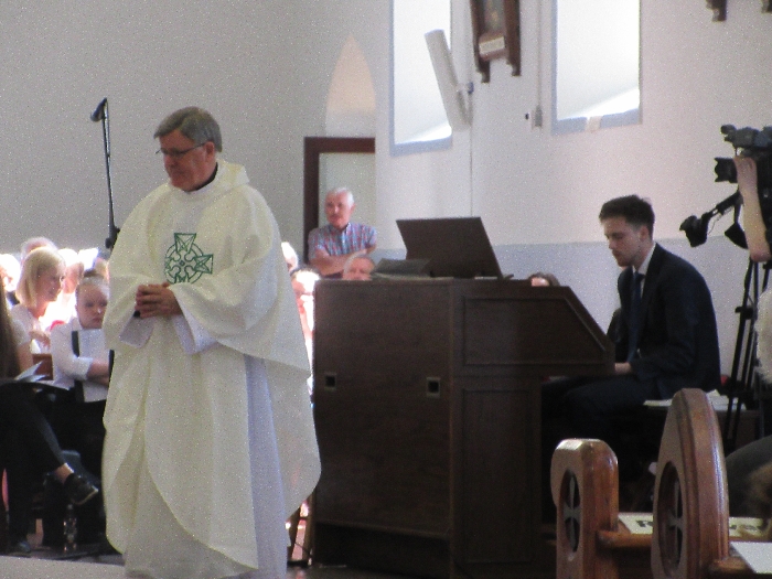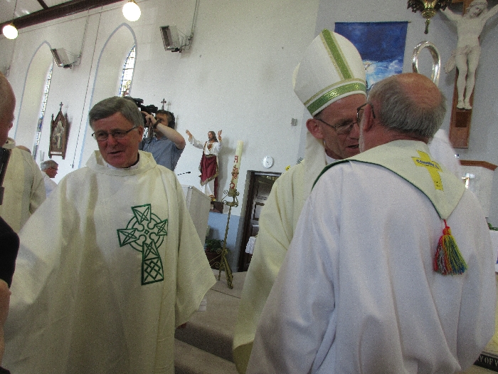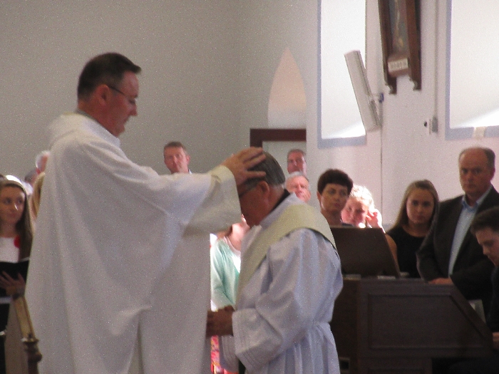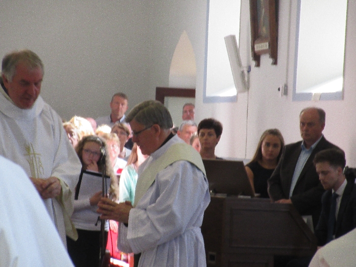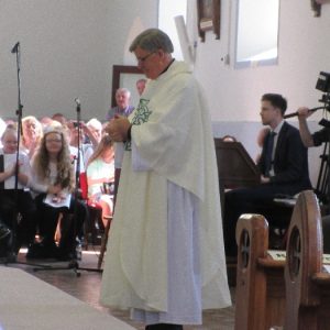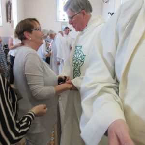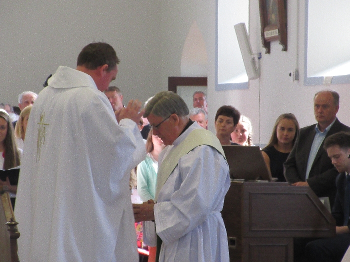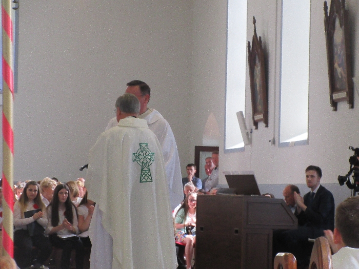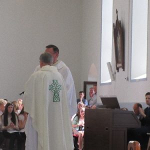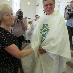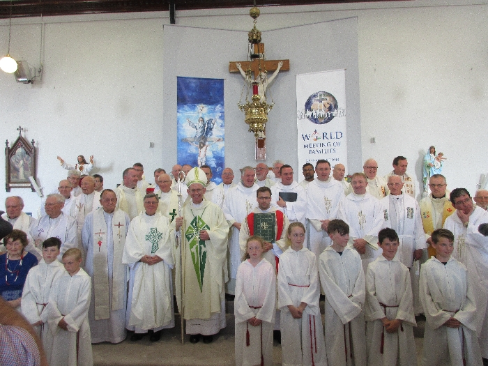 Rev. Martin Shanahan was ordained to the priesthood for the Diocese of Killaloe by Bishop Fintan Monahan in St. Mary’s Church, Mullagh, Co. Clare on Sunday 3rd June 2018 at 3.00pm, (the Feast of Corpus Christi). In his homily Bishop Fintan focused on the centrality of the Eucharist in the life of the priest. He reminded the congregation of Martin’s great work in spearheading the renewal of Eucharistic Adoration in many parishes throughout the Diocese of Killaloe saying; “The diocese is deeply indebted to him for the outstanding service offered in promoting this powerful prayer apostolate. His work has a long lasting and continuing legacy of prayerfulness and communion with God in such a special way.” Bishop Fintan also expressed gratitude for the experience that Martin brings to the priesthood from his working and family life. Martin’s wife, Mary Margaret, who died in 2011, was especially remembered during the ordination ceremony and their son Eoin was the organist for today’s ceremony.