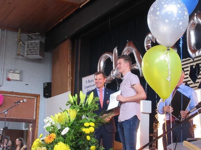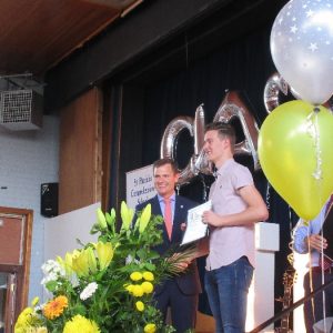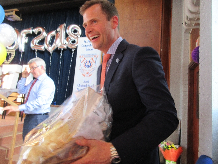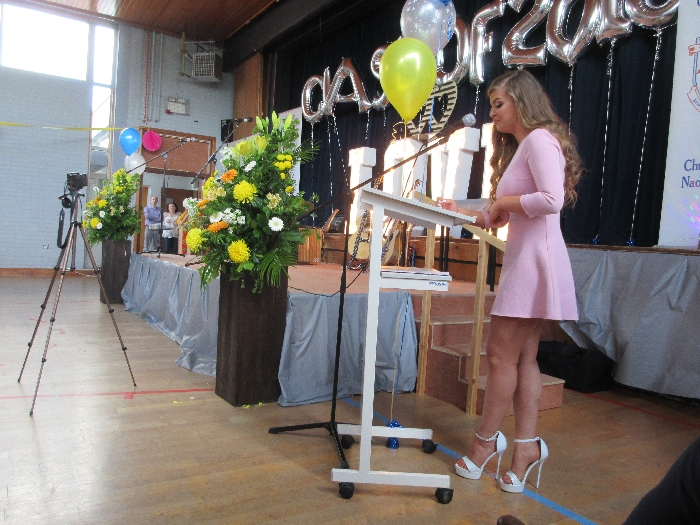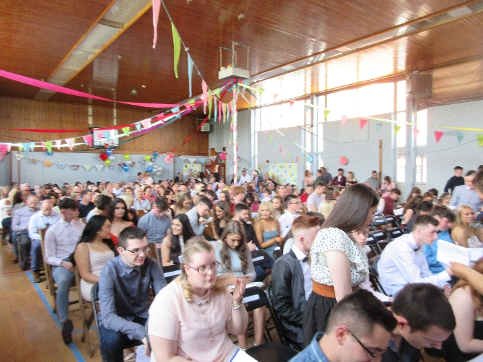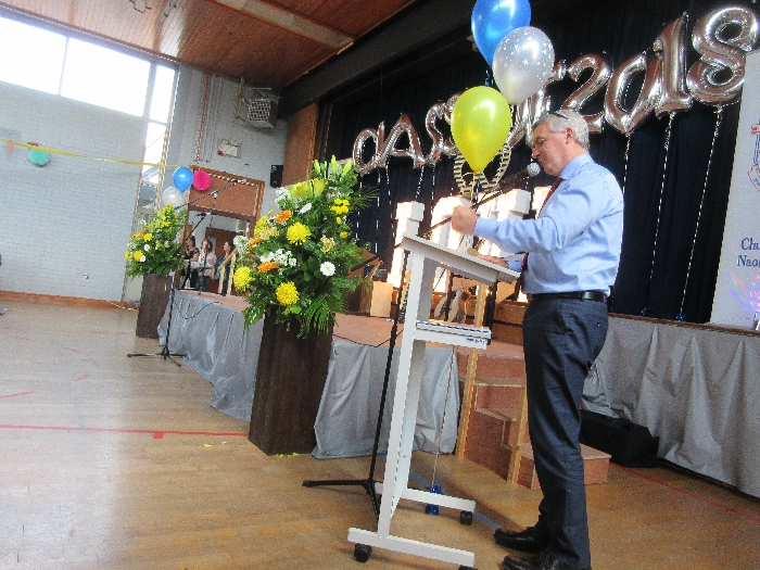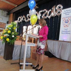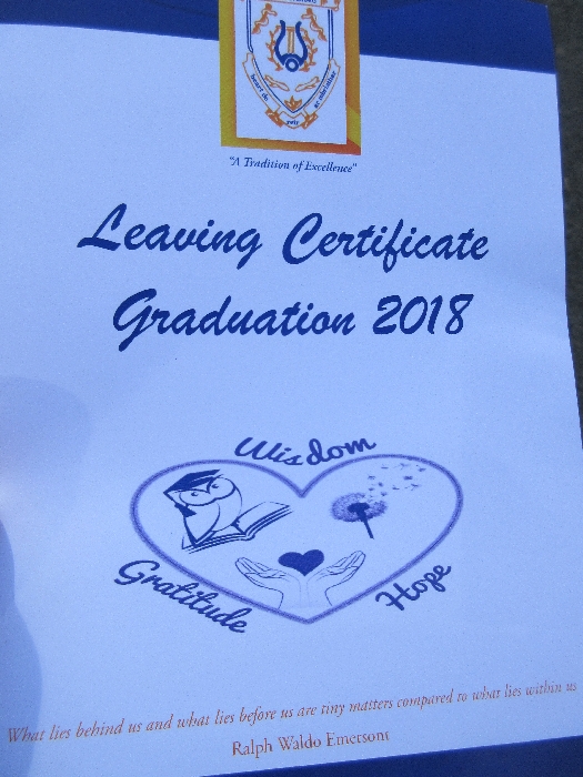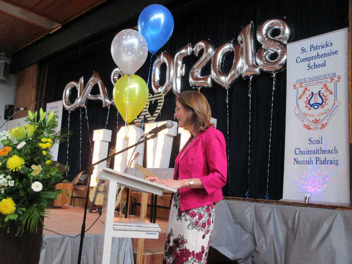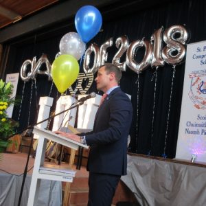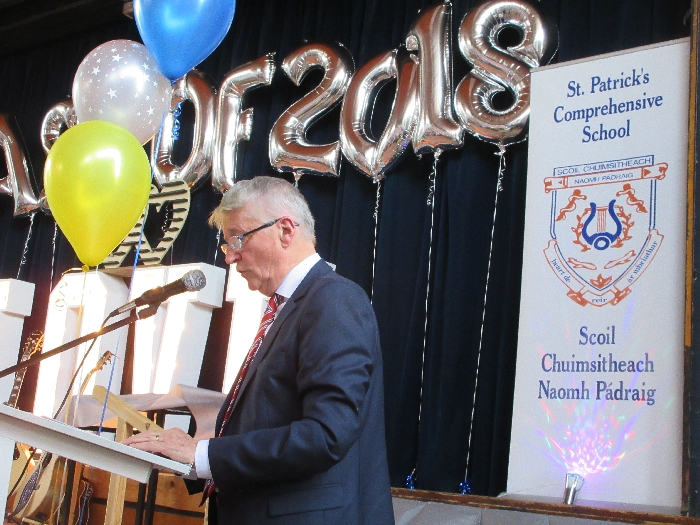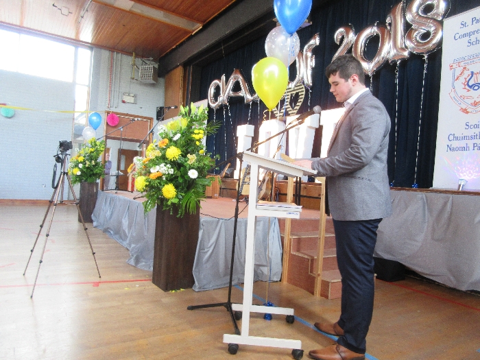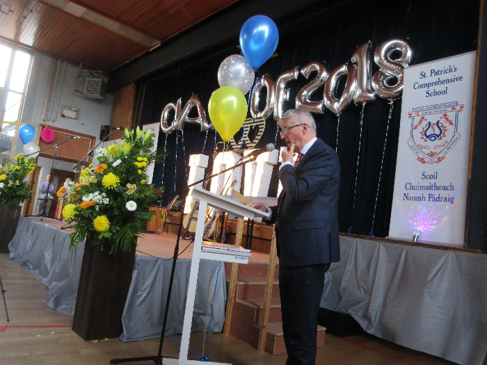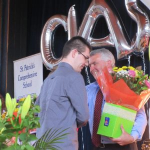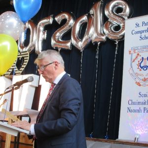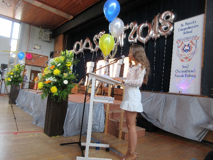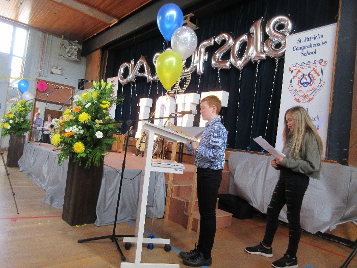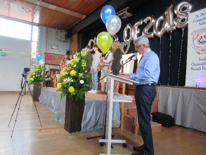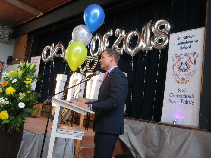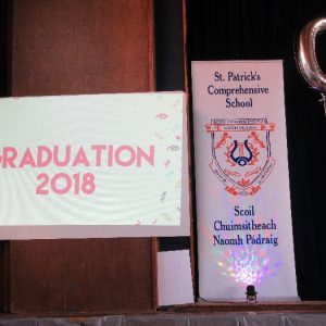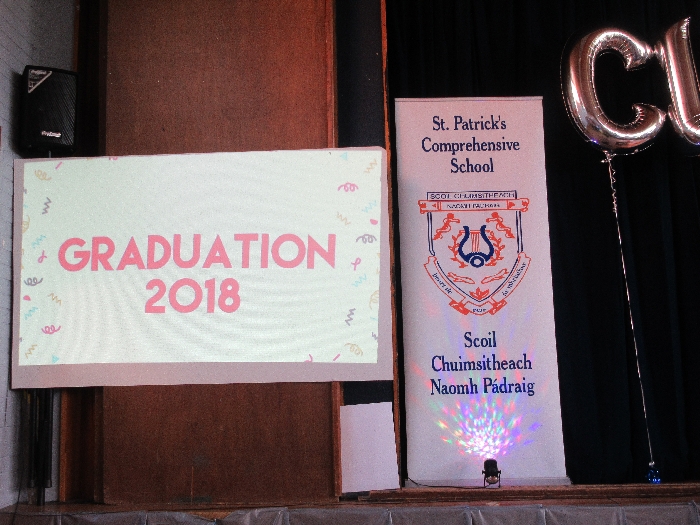 he assembly hall of St Patrick’s Comprehensive School was full to capacity on Friday 25th May as the class of 2018 graduated. The gathering began with words of welcome from Mr Morgan Heaphy, School Principal, as he introduced the talented voices and music of the class. This was followed by video memories of the class of 2018. First year pupils Darragh Riordan and Leah Halpin shared with their Leaving Cert colleagues and wished them well for their exams and future. Ms. Siobhan Hickey, Year Head, and Mr David Deighan, Chairman of the Board of Management, both addressed the gathering.