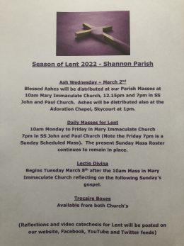 Schedule of Parish Masses for Ash Wednesday and the Season of Lent.