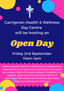 Carrigoran Health & Wellness Day Centre Open Day Published on September 1, 2022 Carrigoran Health and Wellness Day Centre are hosting an Open Day on Friday 2nd of September. All are welcome.