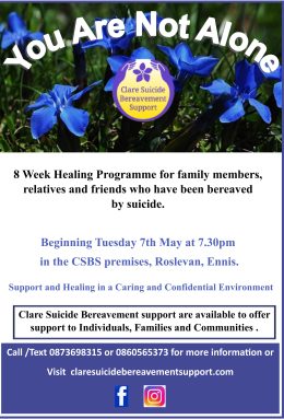 Clare Suicide Bereavement Support 8 weeks programme beginning Tuesday 7th May @ 7.30pm in the CSBS premises Roslevan Ennis.