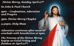 Divine Mercy Sunday, April 27th Published on April 25, 2025 This Sunday, April 27th is Divine Mercy Sunday. We will celebrate this occasion with the following in SS John and Paul Church: 2pm – Confessions, Adoration and prayers 3pm – Divine Mercy Chaplet 3.30pm – Holy Mass All are welcome to attend.