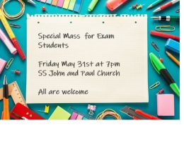 This Friday the 31st of May, Mass at 7pm is being offered for all Junior Cert and Leaving Cert Students. You are all welcome to join us in this time of prayer.