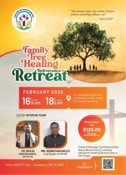 Anointing Fire Catholic Ministries are holding a two day Residential retreat- Family Tree Healing & deliverance retreat at St Flannan’s in Ennis starting Sunday 16th February at 10am to Tuesday 18th February finishing at 9am. Praise and worship/ Confession/Holy Mass /Word of God /Eucharistic Adoration/Healing Service/One to One prayer. This will be a powerful retreat. Book your place now. Total cost including accommodation and food = €125 per person.