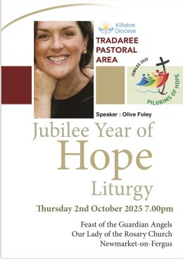 We live in a world where there is great need for Hope. This year is a Holy Year focused on Hope. Bishop Monahan has designated the Church of Our Lady of the Rosary, Newmarket-on-Fergus as a pilgrimage centre for the Holy Year. Our pastoral area has organised a celebration of hope to take place in the Church of Our Lady of the Rosary, Newmarket-on-Fergus at 7pm on Thursday, 2nd of October (Feast of the Guardian Angels). Olive Foley from Killaloe will share a reflection on hope in her own life. All are welcome.