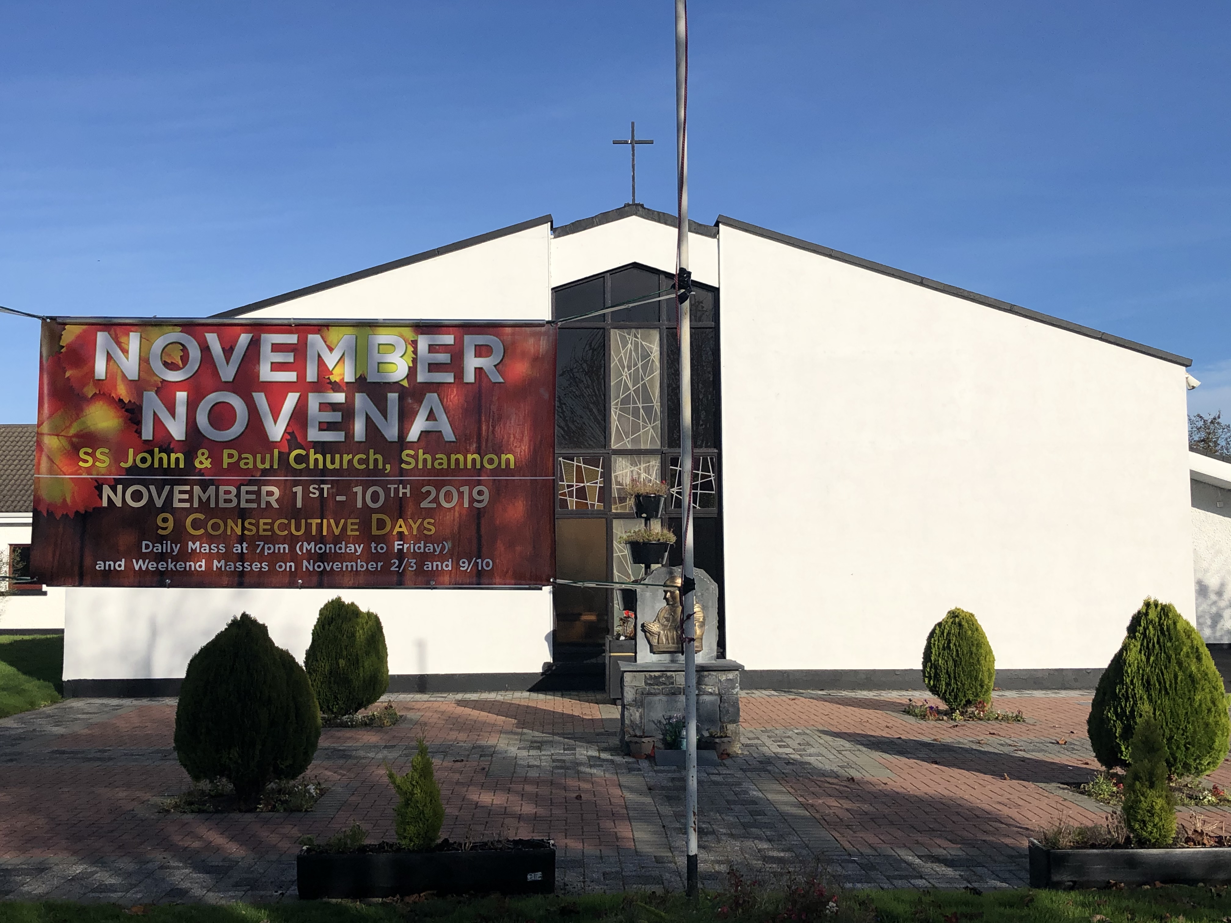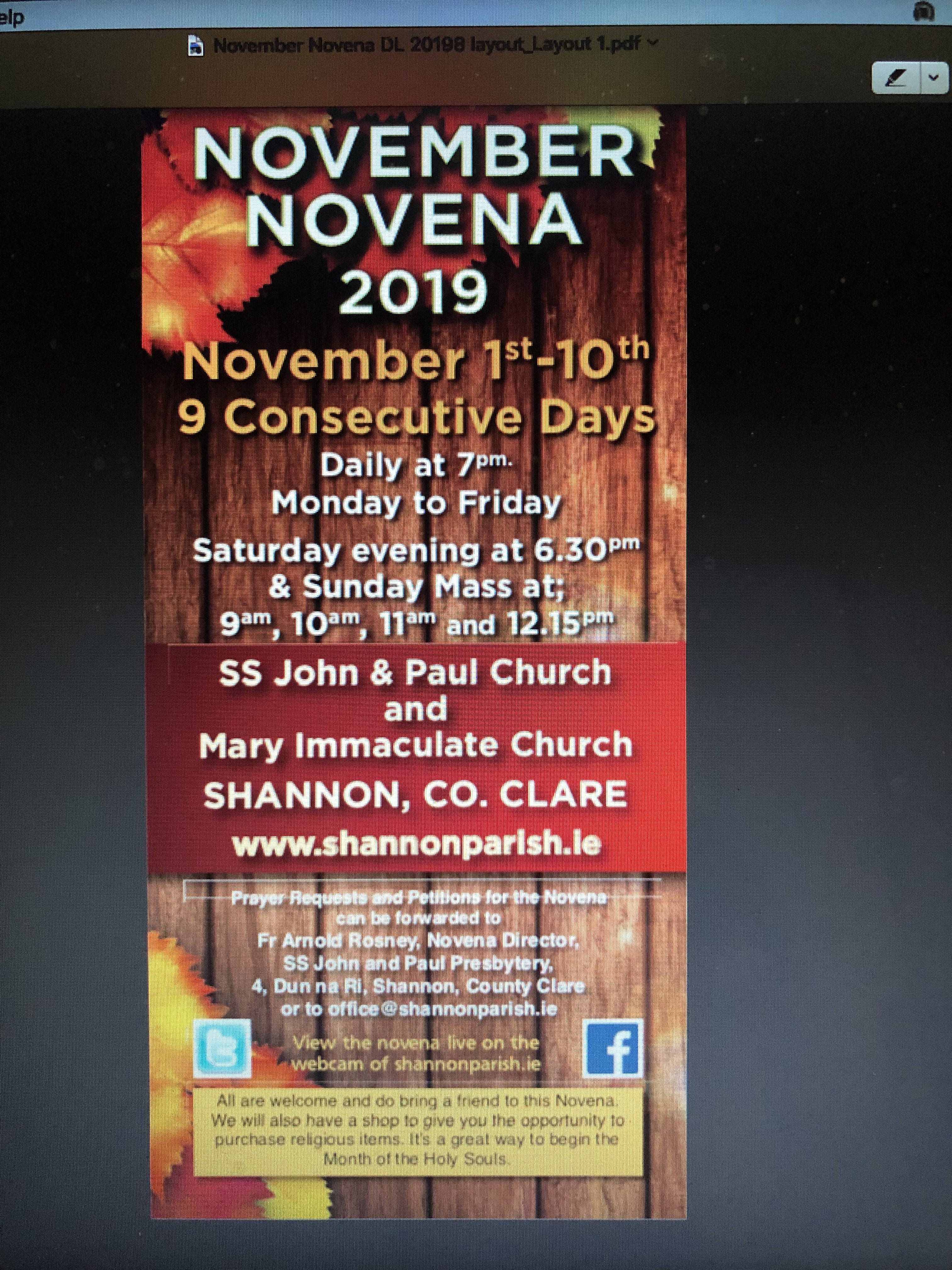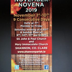 Friday at 9am and 11am in Mary Immaculate Church, and 12.15pm and 7pm in SS John and Paul Church. The November Novena will begin at the 7pm Mass on Friday in SS John and Paul Church. Bishop Fintan will lead us on this first evening of our Novena. All are welcome!