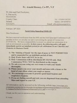 We received notification from the HSE and the Irish Episcopal Conference in regard to best practice for celebrations in our Churches and Oratories. Enclosed is a parish letter which will be displayed at all Church notices in regard to best practice. The notification from the HSE can be accessed on www.hpsc.ie
