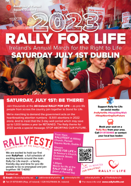 “DON’T MISS IT! Rally for Life on the 1st of July! Join thousands of fellow Catholics & pro-life supporters at the biggest annual pro-life event, now in its 17th year. Gather at 1PM at Parnell Square, Dublin 1. Activities for both children and adults, a family friendly event!
