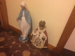 A Parishioner has two statues for anyone who would like to have them. Maybe someone interested in making a Grotto … or perhaps a religious institution? One statue is the traditional type statue of Our Lady in good condition but needing a little paint, the other is the Child of Prague, missing a little on the head. The Child of Prague is basically a statue of the child Jesus in decorative clothing, dressed as a king. This imagery was introduced to Ireland by a bishop in the 18th century, during Penal times. Throughout the 20th century, most Catholic households would have had a Child of Prague in their houses, usually placed in the window or on the dresser. This statue has some superstition or folklore in Ireland. It is believed that if you placed the Child of Prague outside in your garden on your wedding day, it would help hold off the rain, bring good weather and good luck.