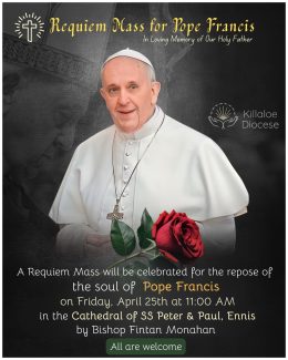 A Requiem Mass will be held to honor the soul of Pope Francis — a shepherd of peace, humility, and compassion. Join us in prayer and remembrance on Friday, April 25th at 11:00 AM at the Cathedral of SS Peter & Paul, Ennis, led by Bishop Fintan Monahan.