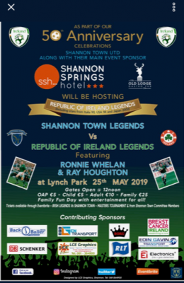Shannon Town AFC continue their Jubilee celebrations with a soccer match you will not want to miss! Shannon Town Legends vs Republic of Ireland Legends, featuring Ronnie Whelan & Ray Houghton at Lynch Park, this Saturday 25th May. Family fun day! Gates open at 12 noon. Entertainment for all!