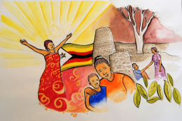The painting (by Nonny Mathe, a Zimbabwean born artist who lives in Bulawayo, Zimbabwe) portrays people’s lives in the society. The top part background from right to left represents a transition from a dark difficult past as a nation to a more prosperous and promising future.